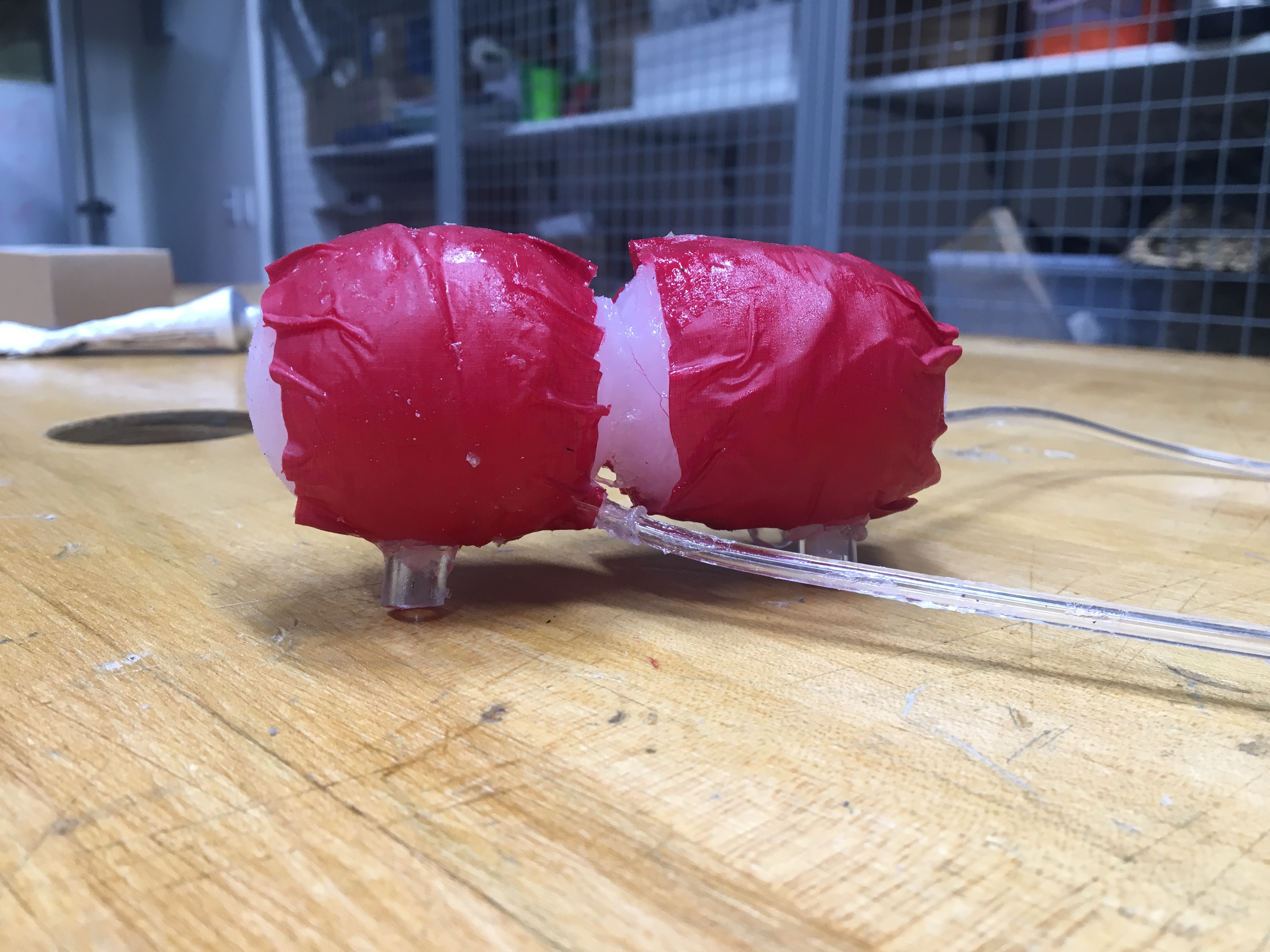Our soft robot was a silicone worm robot made of two silicone bubbles that when inflated would allow the robot to move forwards. Each bubble is a hollow silicone sphere with a pneumatic tube inserted into the center and wrapped in inextensible fabric to prevent the bubble from expanding in all directions. When the bubble is filled with air, it expands in length while maintaining a constant width due to the fabric. Therefore, when the bubble expands, it pushes outwards. The robot moves by expanding one bubble, then the other, then deflating the original bubble and then deflating the other bubble. The bubbles also have frictional feet made of large pneumatic tubing at the bottom, so when the bubbles expand, the frictional feet hold on to the surface and allow the robot to move forwards. The applications of this robot are that it could go in to environments that are unsafe for humans to collect data or since it is small, it can observe animals without being noticed.
