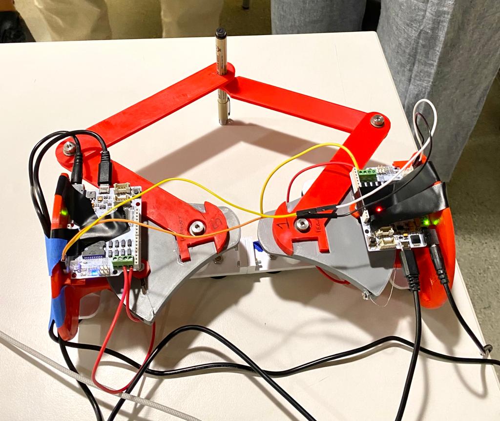 Our main goal for the first checkpoint was to manufacture and assemble all the necessary hardware for our device. We referenced the Two-Degree-of-Freedom Devices page on the Hapkit resources and selected to use the Graphkit design as it closely matches the requirements and use-case of our design. We 3D printed and purchased the additional necessary components (beyond two Hapkits) in Room 36 and assembled the links according to the instructions to form a pantograph device. One modification we may make is to cut away part of the Hapkit base to give a larger workspace. Currently the interference between the Hapkit bases and the links connected to the handles puts a restriction on the movement of the stylus, creating a small, wedge-shaped workspace.