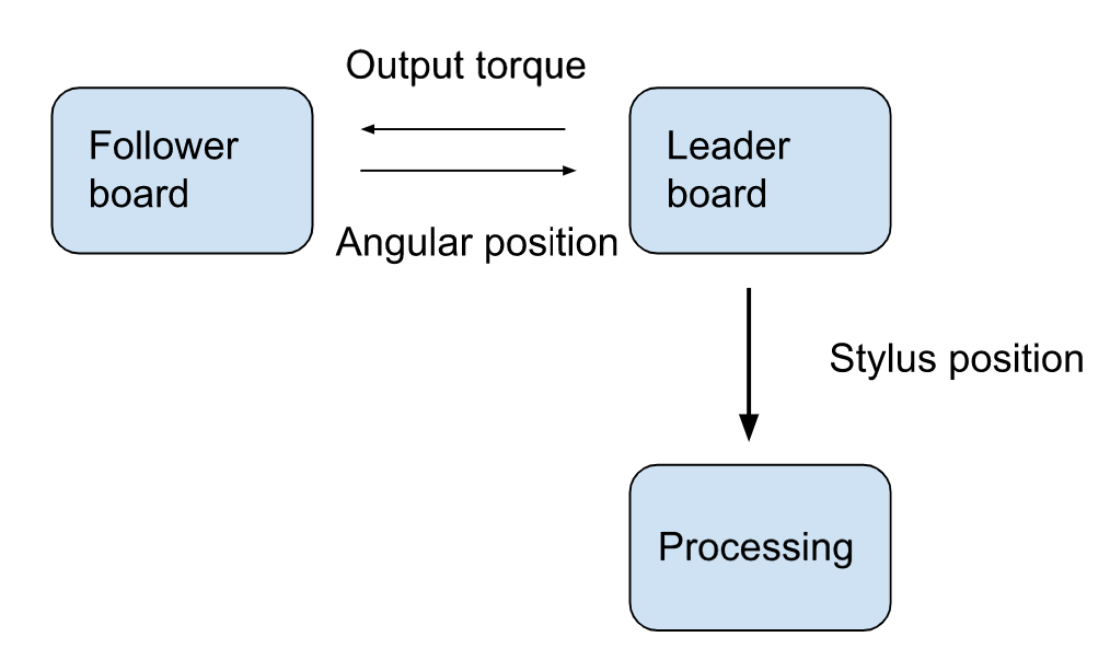 The leader board computes the stylus location with the equation described in the section above and renders the forces and torques for haptic feedback for the user to follow a circle. In order to communicate the stylus location to Processing, another communication channel had to be set up to exchange information between the two boards. The leader requests the handle angle from the follower board and sends back its torque value for the motor output. The force rendering has been coded up but not tested yet; we will work on that in the next few days.