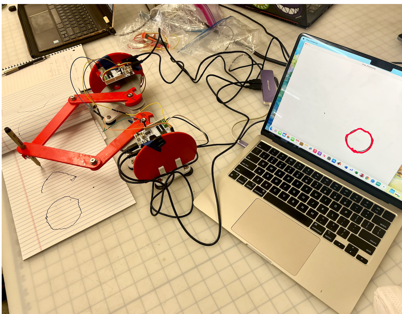 We were able to achieve an okay amount of traceability from the pantograph to processing. The structure of the processing code is correct in its ability to display an input x and y position, however, this position needs tuning. Once we start applying forces the processing graphics will be fine tuned for the final result. As seen in the picture attached, the processing rather accurately displays the drawn circle, albeit shaky. Our goal is to reduce this shakiness by addressing the mechanical issues described below.