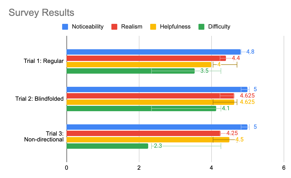 In total, we collected data from N = 20 individuals on the standard experiment, including 9 individuals who tested the blindfolded mode as well. We also were able to invite 15 of those participants to take a short survey on their experience using the device. We modeled the survey after Assignment 5’s peer review survey, asking participants four questions: “noticeability of haptics,” “realism of haptics,” “helpfulness of haptics,” and “difficulty of task.” Each question was rated using a 5-point Likert scale, with 5 representing the most and 1 the least.