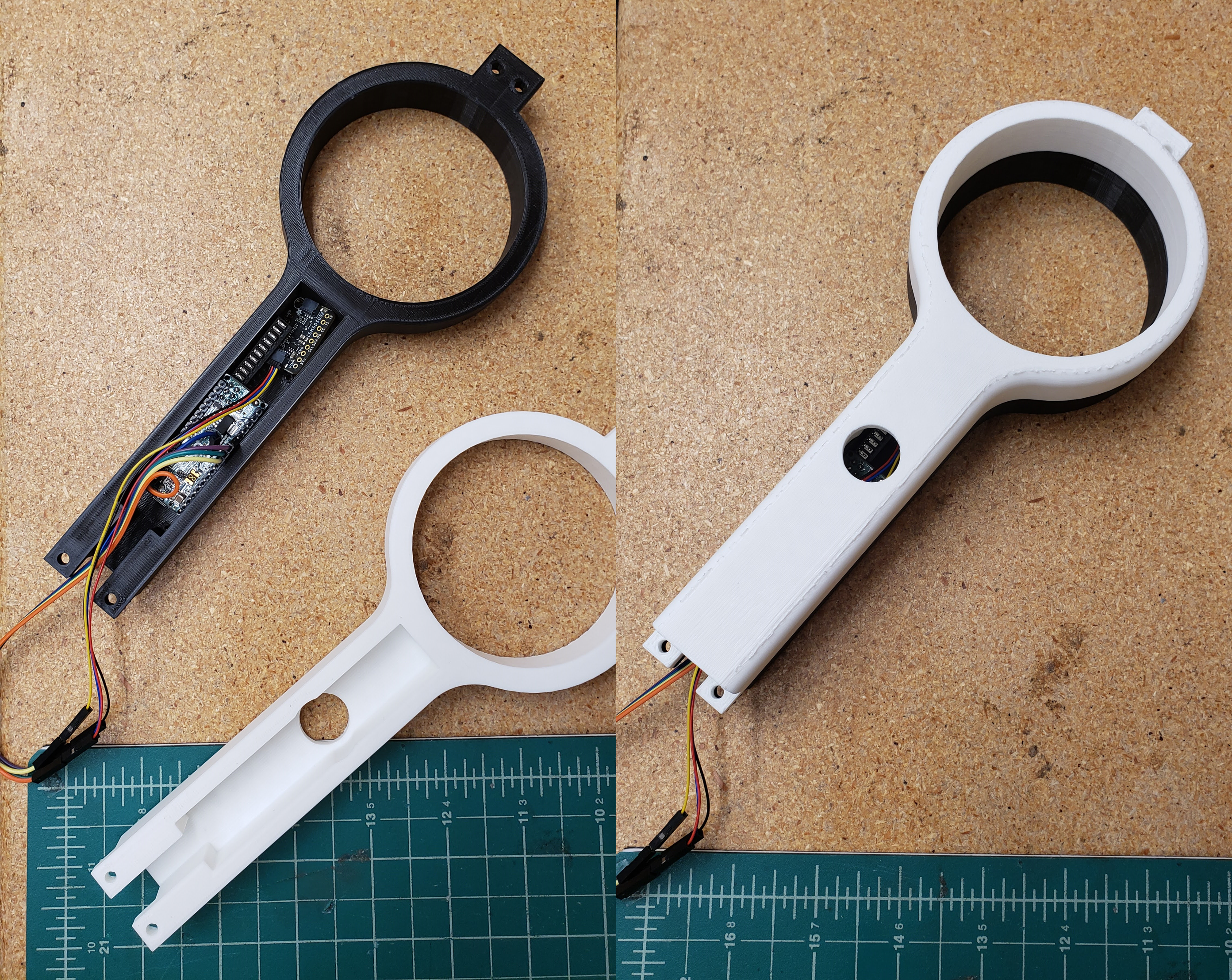 For the initial design, we decided which materials were the best fit for our project (see BOM here, and received all the electronic parts to begin our design. We also began by 3D printing a wand, with space for screw mounting an Arduino Micro, an Adafruit LSM6DSOX 6-axis IMU, a button for resetting the position and orientation if dead reckoning became too erratic, as well as general wiring space. Shown below are the assembled prototypes.