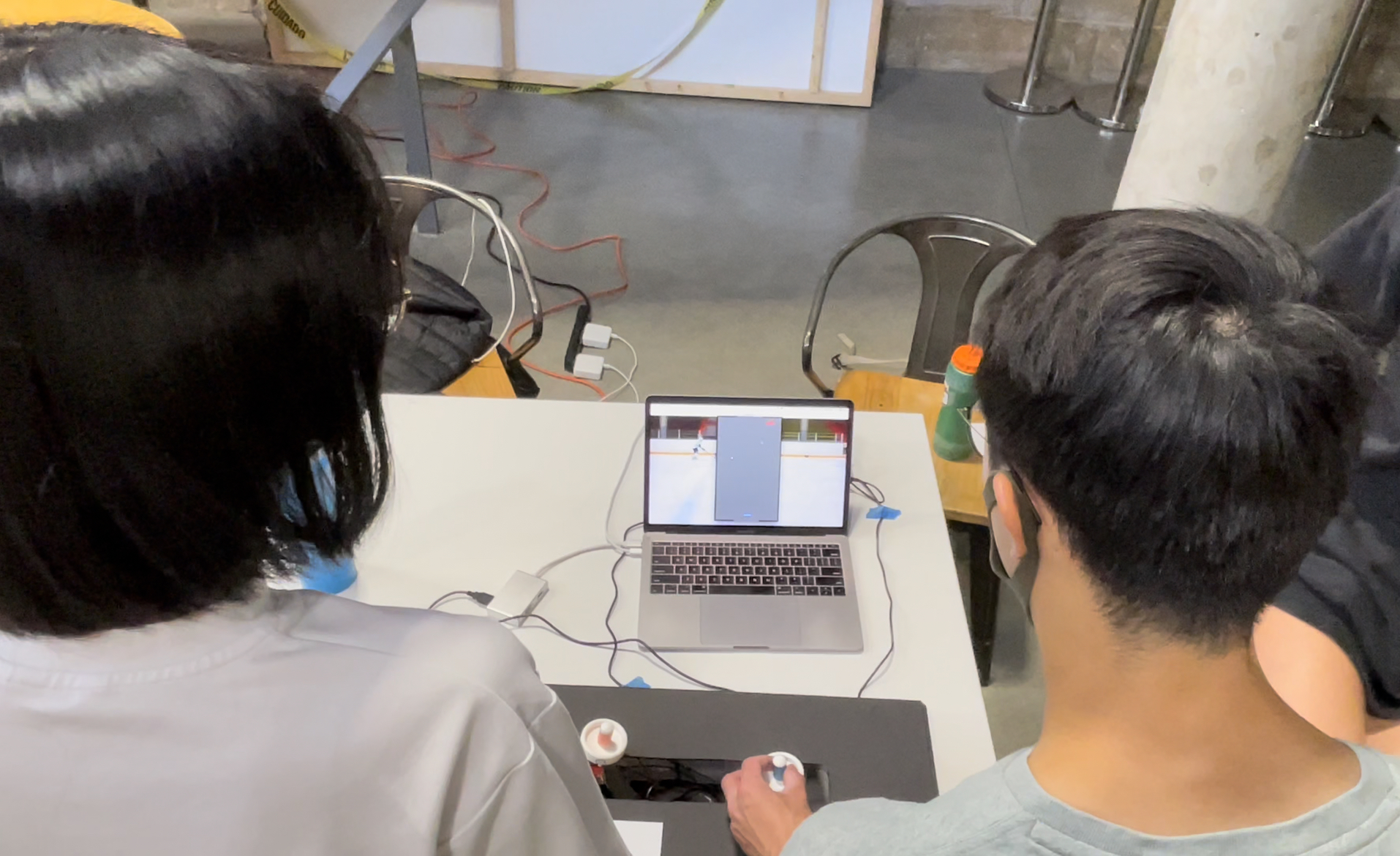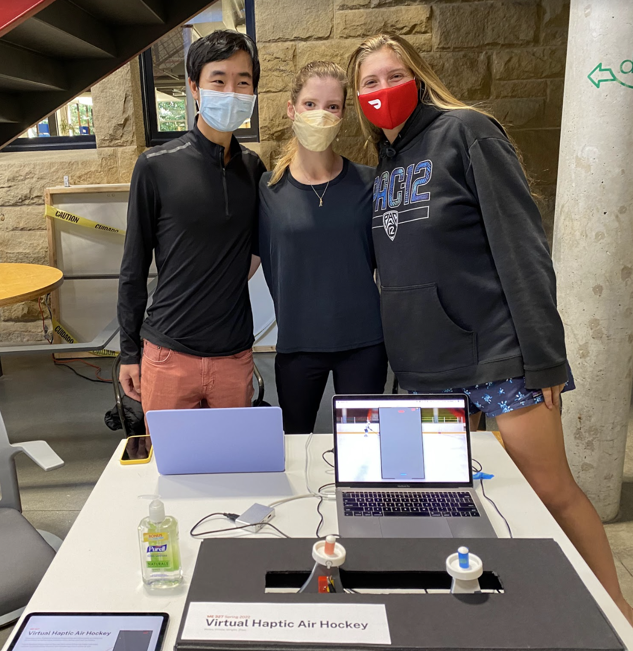 Users gave incredibly positive reviews, with multiple themes recurring in the sentiments. Most users immediately upon first collision with the virtual puck commented on the collision experience (directed force plus vibration) being incredibly convincing. Many unknowingly pointed out the success of the haptic illusion created by the vibration, asking how the vibration was directed longitudinally, and leading group members to reveal that in reality the vibration was not longitudinal but seemed so due to game context. Others pointed out the believability of collisions due to the force directed in the same direction as puck lateral velocity. Lastly, many noted that the free space “felt really free,” a sensation hoped for by the group considering that in real air hockey the felt bottoms of the mallets lead to nearly frictionless movement.