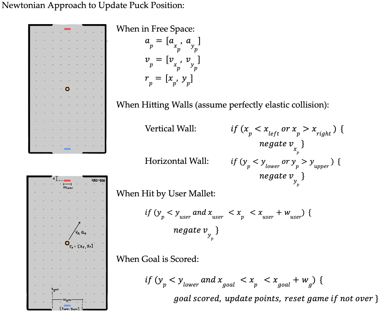 First, before any user is introduced, puck motion is created using Newtonian laws of motion. Acceleration/velocity are defined and position is then integrated. Interactions with walls are assumed to be completely elastic (no change in velocity magnitude upon collision).