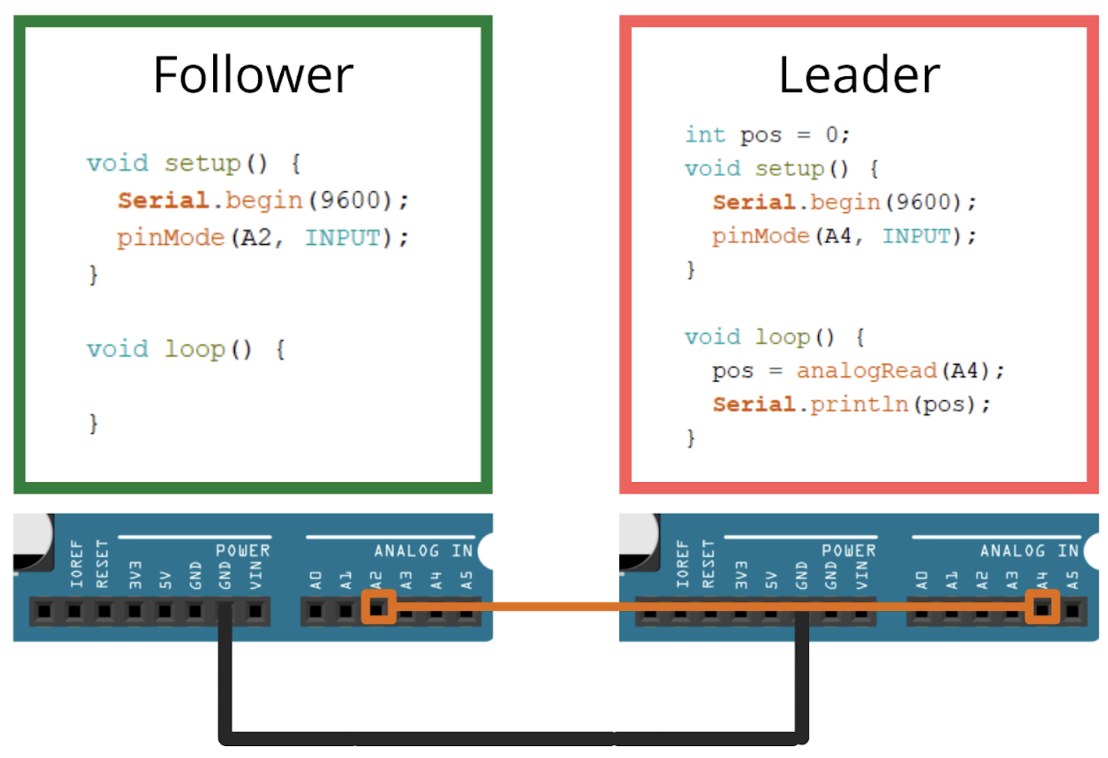 A leader and follower system was implemented for communication between the Hapkits. The follower retrieved analog data from its MR sensor, and the leader converted data from the follower into position values. The leader was running its own MR sensor and had two motor drivers. Because it received both position values from each Hapkit, it was able to drive both motors on the Hapkit. All of the kinematics and force calculations were done through the leader, which allowed for the players’ positions, and the puck positions to be printed via the Serial monitor to the Processing visual environment.