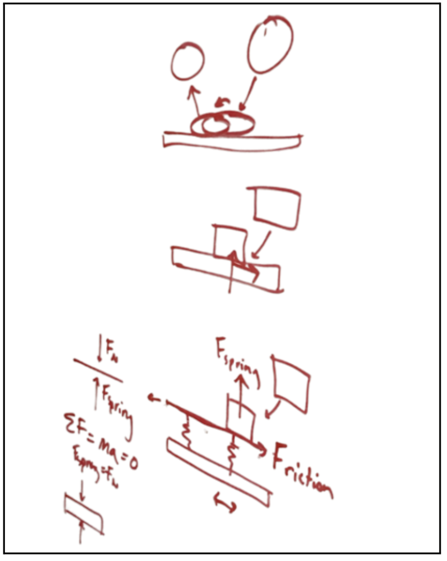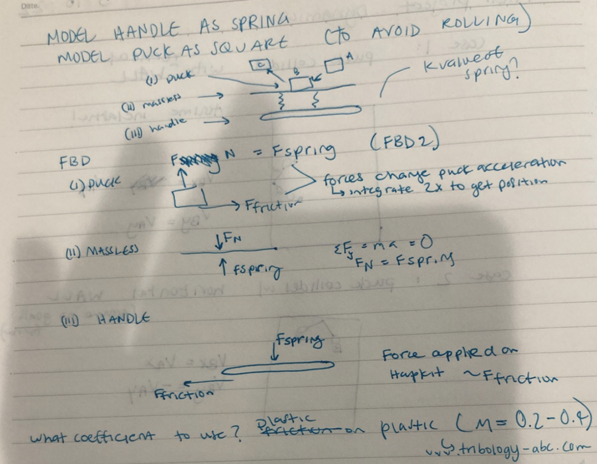The handle is modeled as a spring, with the top surface above the spring being massless. The puck was modeled as a square to avoid rolling.