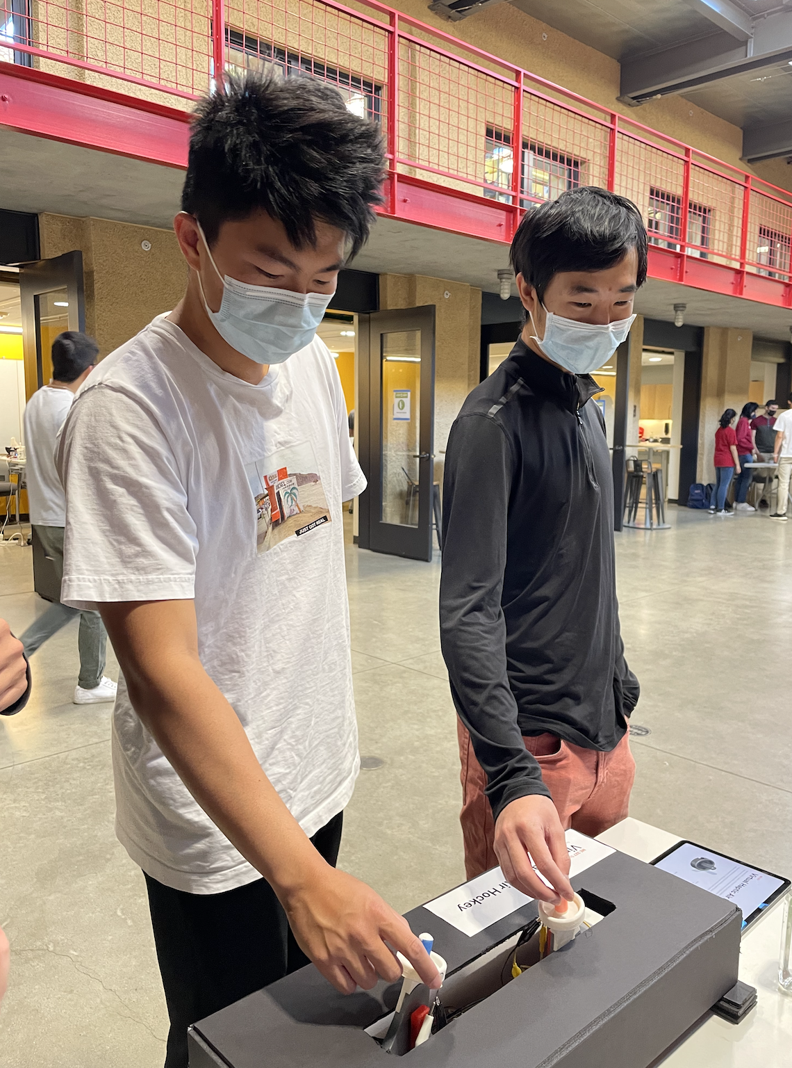 For the demonstration day, the group had two users play each other in Virtual Haptic Air Hockey. Players would score a few points, test out different strategies for winning or manipulating the puck, and ask any questions they had on the implementation. The group ensured they experienced all of the features: felt the force at each wall, the vibration and force feedback upon puck collision, and scored a few goals. The group also showed how the handle moves when the user does not hold it and the puck collides with it. Overall people had fun playing hockey!