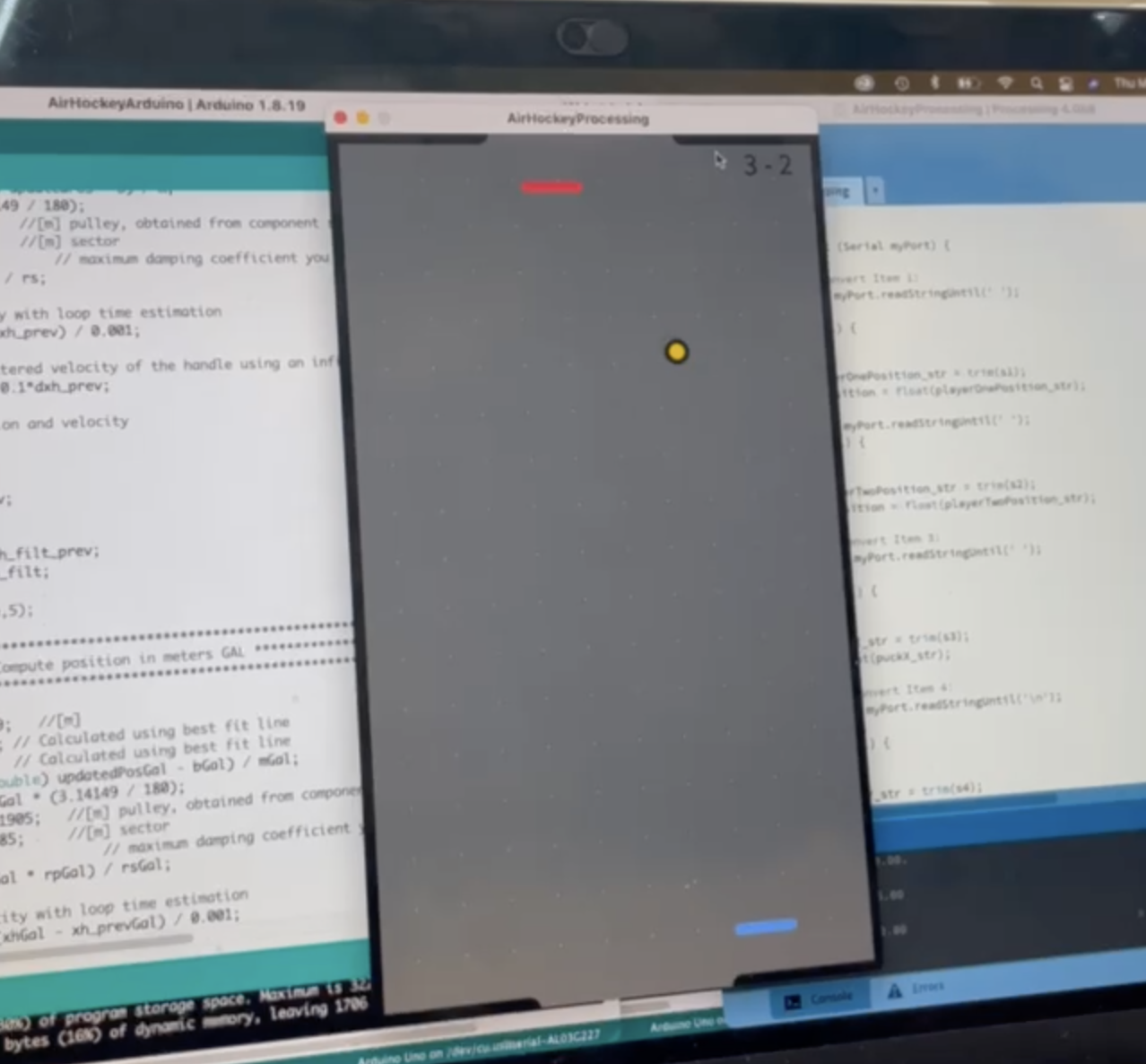 Some issues we encountered but navigated included aligning/mapping Arduino and Processing locations of items like player mallets (i.e. so that the puck did not bounce off of invisible/incorrectly-located mallets/walls), erasing the previous puck each time the puck updated its position, ensuring goal-scoring was precise, adjusting vibration code for vibration motors, finding replacement vibration motors after originals went missing, ordering the Arduino loop so that gameplay was smooth (and so the ball didn't get stuck after scoring), and making gameplay more realistic (adding a delay after scoring, adding scores to the Arduino communication items, etc.).