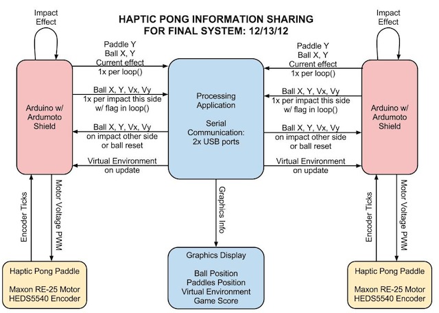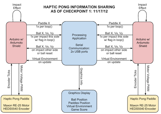 The decision of which device handles collision detection is not finalized yet. Right now, we think that it makes sense to have each Arduino completely aware of the state of the virtual environment, and have it pass the new ball trajectory to Processing, which will in turn pass it to the other Arduino, upon impact. We came up with this strategy based on position information handling a networked Haptic game, Haptic Battle Pong.