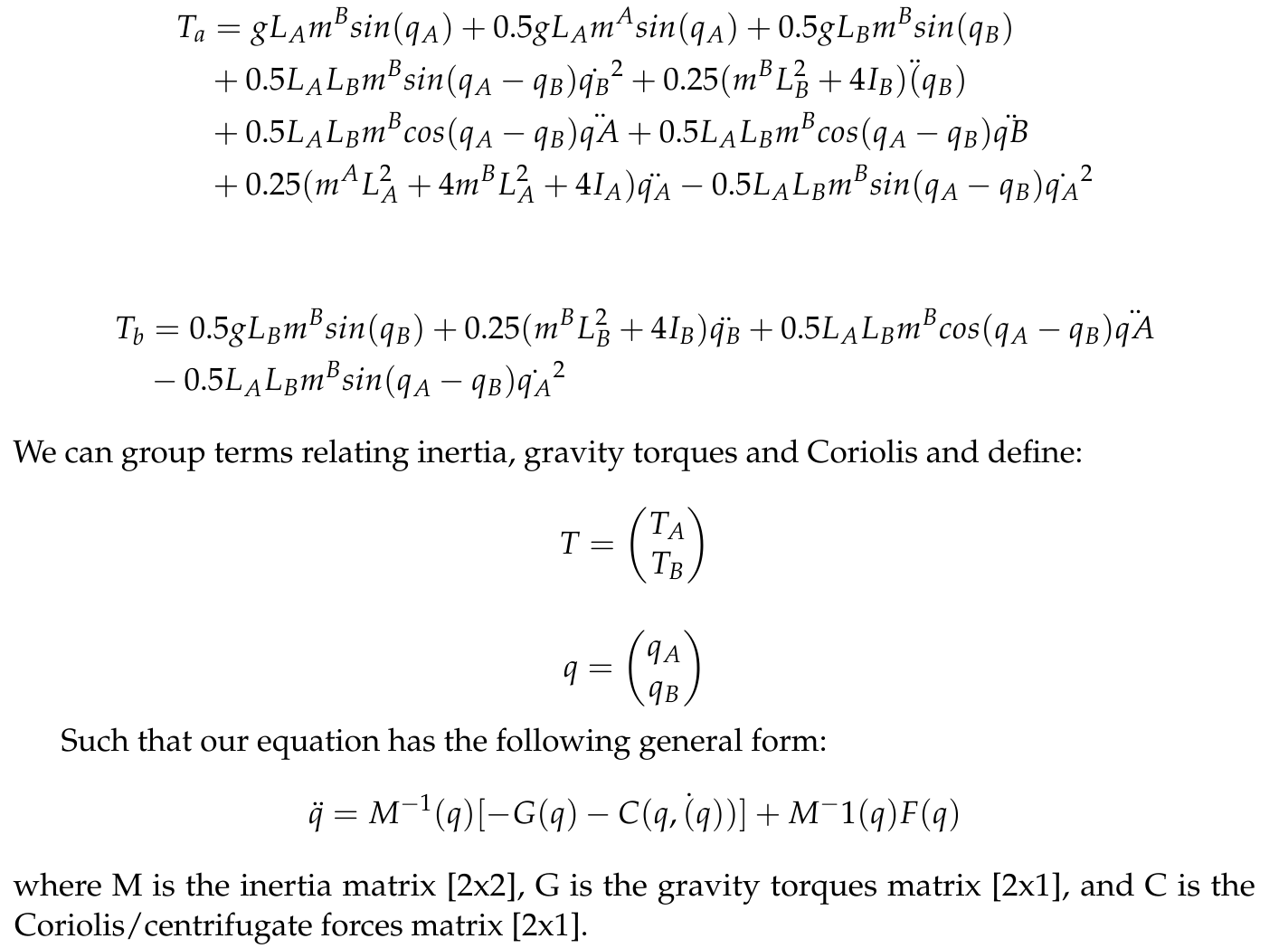 For deriving the dynamics equations, we used MotionGenesis (http://www.motiongenesis.com/) software. Detailed code and outputs can be found here: Attach:MG-code.zip. The resulting equations relating torques at each joint and angles are as follows: