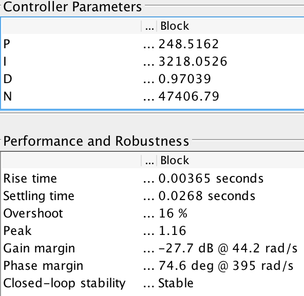 In light of these challenges, we used the "Tune" function Simulink provides as a feature of its controller blocks. Going off our (admittedly false) assumption that the two arms act independently, we tuned each controller separately by manually adjusting the "response time" and "transient behavior" sliding bars provided by the function. It should be noted that these adjustments were made to optimize the step response of the system, and do not fully predict how the system behaves in response to the actual qA and qB inputs. Nevertheless, we used the step response of the system to analyze time domain performance of the system, and analyzed the reference tracking bode plot in order to assess our system's stability. For Arm A, we were able to achieve an overshoot of 16% and a small, but still somewhat noticeable, steady state error, as can be seen in the figure. There was practically no oscillation in the first arm's step response. For Arm B, we were able to achieve a similar overshoot of 15.8%, but encountered almost no steady state error. While there was more oscillation in Arm A's response than in Arm B's, it was not particularly noticeable. Surprisingly, all of the oscillation occurred as the system was overshooting. Once the system began to decline to its steady state value, the oscillation had all but dissipated.