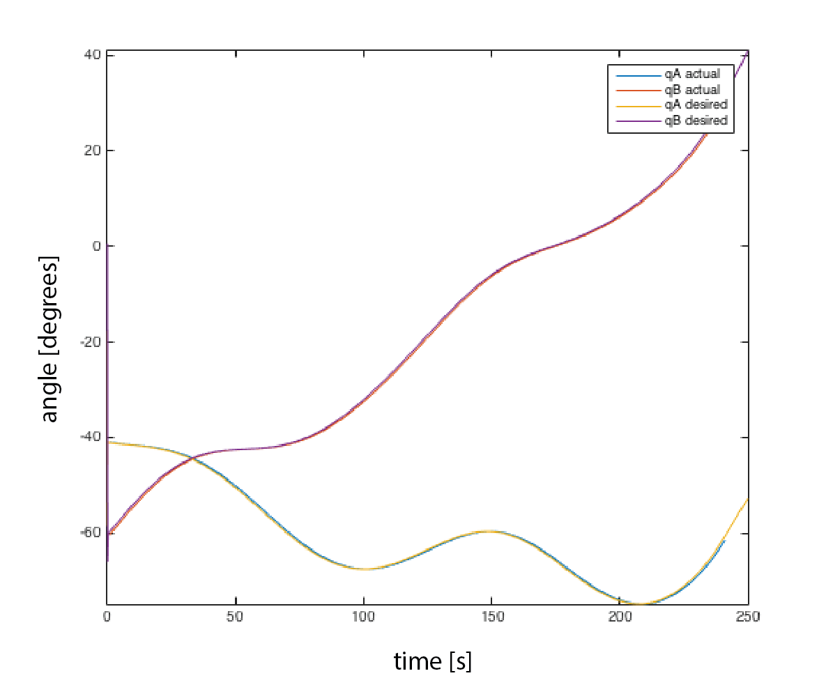 Our control goal was to have the robotic arm follow the desired path as closely as possible To test the performance of our closed-loop system, we generated x and y vectors simulating a desired path. Using our derived kinematic equations, we solved for qA and qB (as shown in the Plant section). The resulting qA and qB are the inputs to our closed-loop system i.e. we input a desired qA and qB, and the output is the actual qA and qB of the robotic arm using the controller.