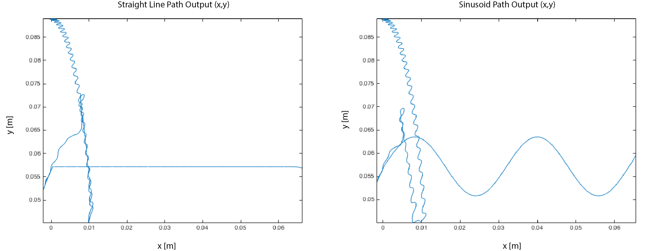 Figure 11 shows the results from our second experiment where the path along x remained the same, but the y path was sinusoidal, with an oscillation of .0063 m and an offset of .0571 m.
