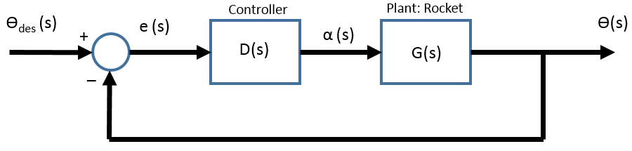 The purpose of the controller is to ensure that the re-entry angle (theta) of the vehicle can be set to a desired value from approximately -15 degrees to +15 degrees, and the vehicle will maintain this angle over time, thus completing a successful reentry. The controller must take in a desired angle (theta_desired), and output a command thrust vector control (TVC) angle alpha. This TVC angle will then be fed into the plant model G(s) as described in the preceding section.