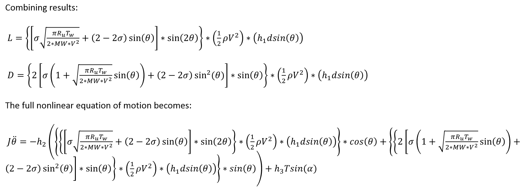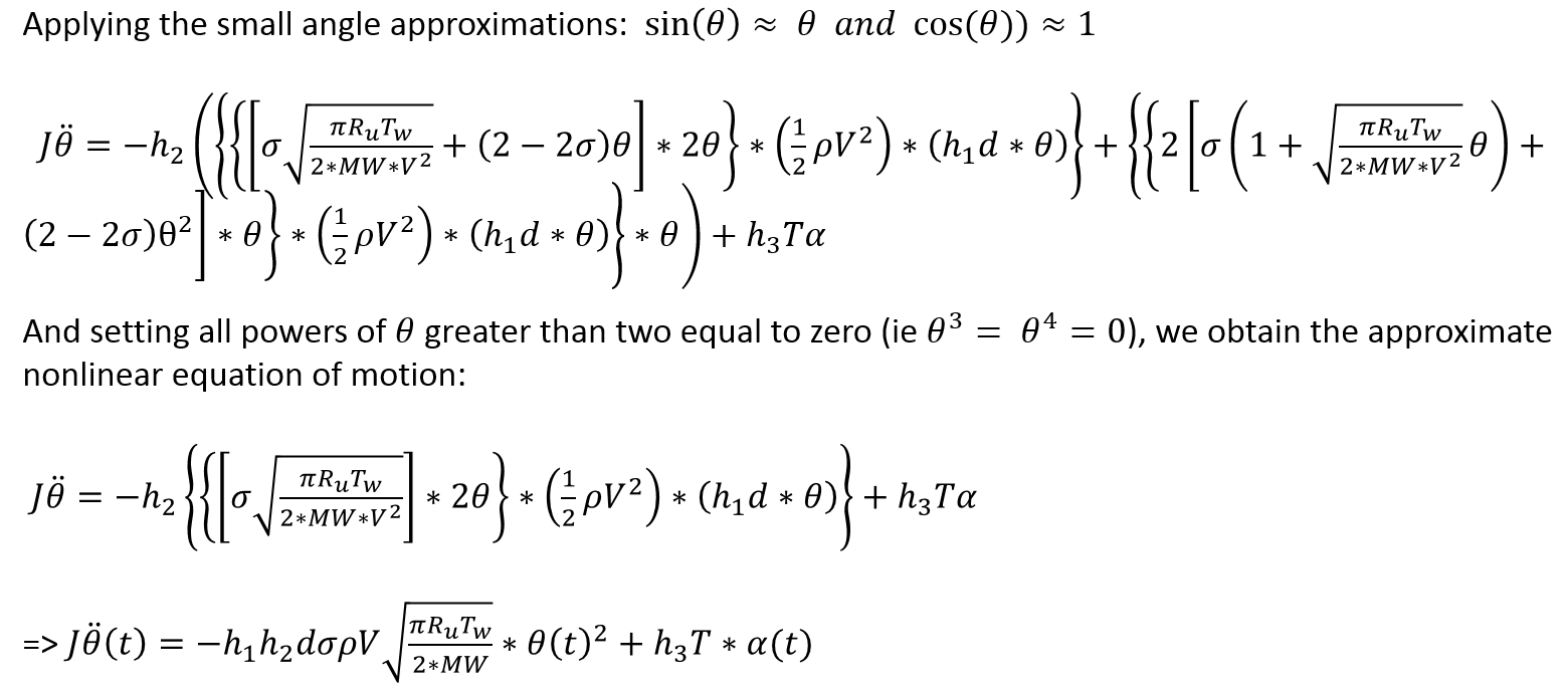 The equation of motion for the plant is derived by considering the summation of moments about the rocket's center of gravity. The lift and drag forces are estimated as those acting on a flat plate in free molecular flow at an angle of attack theta. The derivation proceeds as follows: