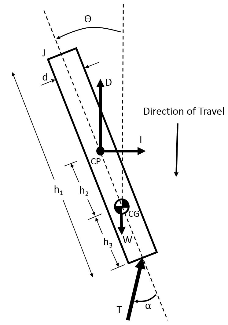 The descending rocket is modeled as a rigid cylindrical rod, rotating freely about its center of mass in response to torques generated by aerodynamic and thrust forces. The output parameter of interest is the angle theta, or the angle of the rocket with respect to vertical. The angle of the thrust force with respect to the vehicle centerline, alpha, will be taken as the plant input parameter and will be used to control the attitude of the rocket. A free body diagram for the system is shown below: