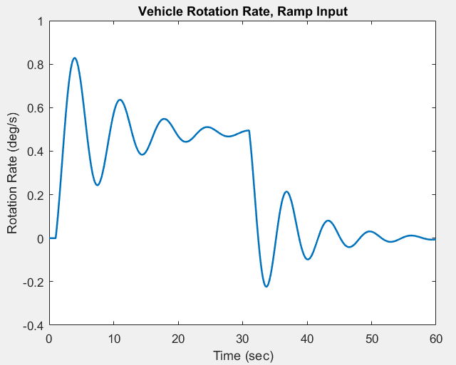 As the plot above shows, the closed loop system tracks the input signal quite well, reaching the targeted 15 degree angle of attack in approximately 45 seconds with zero steady state error and minimal overshoot. The maximum rotation rate for the vehicle with the ramp input is as follows: