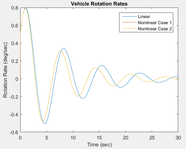 It is noted that the response of both nonlinear systems is virtually identical, as would be expected for small theta. Interestingly, while the response of the linear and nonlinear systems is qualitatively similar, there are substantial differences in both the maximum overshoot and frequency of oscillation. The nonlinear system experiences somewhat lower maximum overshoot, which results from the presence of aerodynamic forces acting on the vehicle to oppose it's rotation, as would be expected.