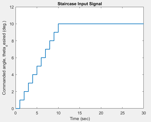 To demonstrate that the closed loop system response is desirable for a more representative input case, a series of 10 distinct one degree step inputs were provided to the vehicle at 1 second intervals, forming a "staircase" input signal. In effect, this signal could be used to command the rocket from a 0 to 10 degree angle of attack. The input signal is provided below for reference.