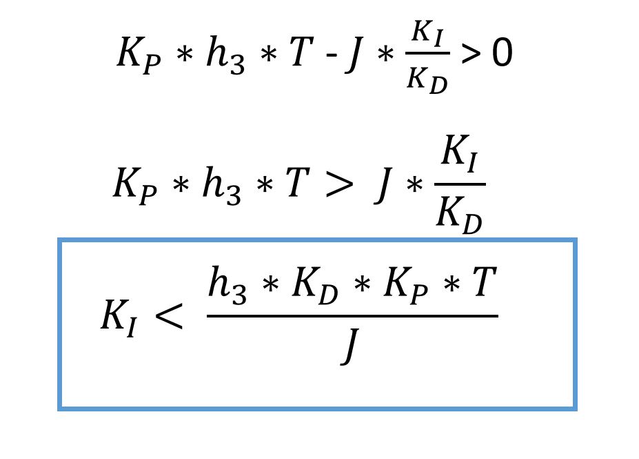 A Routh Array of the linearized model with PID control demonstrated that if Ki is set to 0, any positive values of Kp and Kd will ensure system stability. However, it also shows that adding a positive Ki can force the system to go unstable. The stability criterion for Ki is shown below here: