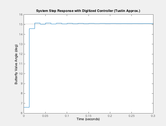 In order to digitize our control system, we needed to convert the continuous controller to a discrete controller by z-transformation. This was accomplished by using the Tustin Approximation in Matlab. Our discrete step response matched the continuous response with a bandwidth of 20 rad/s, found by playing with bandwidth values in the Matlab code, which resulted in a sample time of approx. 0.012566 seconds. There is a very slight steady state error, which is due to the use of the Tustin approximation. The discretized controller is shown below, as well as its response to a 15deg step input (the equivalent of a 15deg accelerator pedal compression), which shows its behavior as compared to the s-domain response.