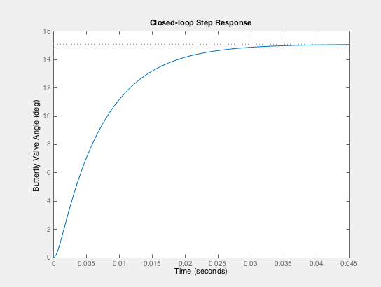 The following step response plot of the closed-loop system for a gas pedal input angle of 15 degrees demonstrates the success of our controller for the given modeled throttle-by-wire system. The output, which represents the butterfly valve angle in response to the input (gas pedal angle) after it passes through our controller, achieves the desired value quickly, with no overshoot, and very little error. Our choice to implement a lead & lag compensator with a low-pass filter proves effective in terms of its speed of response and minimal steady-state error. Another important aspect of the design of the code for the controller (and what allows it to take an input angle and control the torque to hold the valve at that target angle) is the method of calibration that we implemented while testing the closed loop system response. We modulated the values of the input torque (the value of the step response) until we managed to get the system to hold an output angle of 90deg (fully open). From that data point, it was assumed that the electric motor would be capable of providing an input torque linearly from 0N*m to the maximum value calculated (1.59 N*m), and thus a simple gain conversion between input angle and torque was generated (and works rather well!).