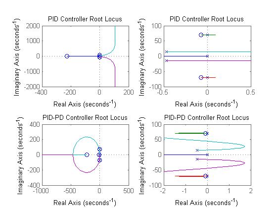 To add zeros in any location on the real axis, a PD controller of the form Kds + Kp can be used which creates a zero at -Kp/Kd. To add complex zeros, a PID is implemented of the form (Kds^2 + Kps + Ki)/s which has the added affect of creating a pole at the origin. The PID controller can create a double zero, a complex zero, or two distinct zeros. Effectively, the PID is Kd*(s+z1)*(s+z2)/s. The open loop plant has four poles and one zero, so we tried to add three zeros to bring the system to closed loop stability. The additional zeros were added near either the suspension complex poles or the aerodynamic complex poles. Overall, this attempt at a controller yielded the following result: