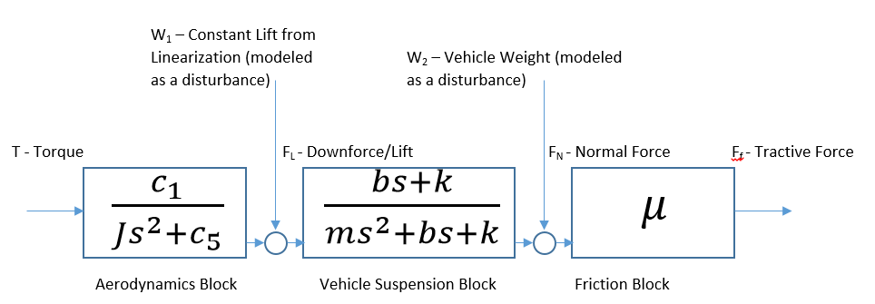 Overall, the plant starts at a torque provided by a motor to control the angle of attack of a car spoiler. This provides a downforce that is transferred through the car suspension, modeled as a spring-mass-damper system, to the wheel to provide a demanded tractive force. We broke this plant into two major subcomponents – the aerodynamics of the spoiler and the vehicle dynamics of the suspension system. The aerodynamics relate the downforce provided by the spoiler at a certain angle of attack to the torque required by the motor to maintain that angle. To generate more downforce, the motor must provide more torque to increase the angle of attack of the spoiler. Once the downforce is calculated, it is used as an input to the vehicle dynamics component. The vehicle dynamics were modeled as a spring-mass-damper system with an input downforce and an output normal force that is seen at the wheel. The tractive force from here is simply the product of the coefficient of friction between the wheel and road (assumed constant) and the normal force. The initial downforce resulting from the linearization of the aerodynamics and the weight of the vehicle, initially modeled as disturbances, each provide a constant tractive force as well. To remove their effects, the demanded signal is not for total traction, but for "additional" traction from a baseline traction (see derivation for further details).