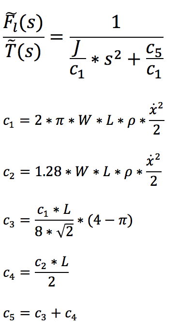 To get rid of various constants (stemming from our linearization of the flap around a 45 degree angle of attack) in our derivation, we specified a nominal torque which maintains that angle of attack. After linearizing, we find the following transfer function: