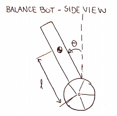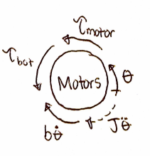 b = friction/damping = 0.028 [Nms^2/rad] g = gravitational constant = 9.81 [m/s^2] J = motor inertia = 1.13 * 10^-2 [Nmsec/rad] l = distance from motor shaft to bot's center of gravity = 0.1 [m] m = balance bot's mass = 0.5 [kg] θ = bot's angle of rotation from the vertical [rad] τbot = torque on the motors due to the bot's mass [Nm] τmotor = torque the motor outputs [Nm]