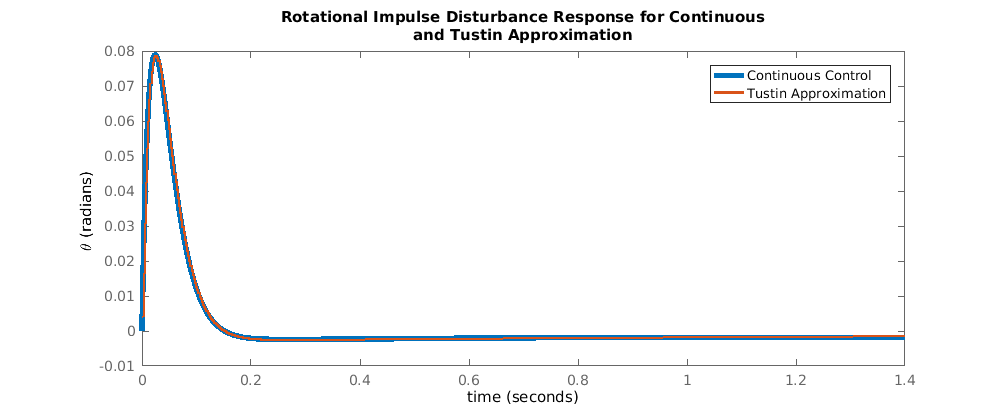 As seen from the Rotational Impulse Disturbance Response plot and the Control Effort Impulse Disturbance Response plot, the Tustin Approximation method and the continuous control case are extremely similar. This means that the Tustin Approximation method provides an accurate representation for the controller and that the digitization of the system using this approximation should cause little to no negative impact on the controller. Additionally, the Impulse Output Response plot clearly shows that the robot initially rotates approximately 0.08 radians (about 5 degrees) from the upright position in response to the 0.1 Nm impulse disturbance signal and then proceeds to correct for this rotation and settles back at 0 degrees. This rejection of small external disturbances, while maintaining a vertical steady state position (0 degrees from upright) is exactly the behavior that is desired from the control system.