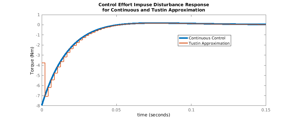 Attach:MillerKobaraDigitalizedControlEffortImpulseResponse.zip: Matlab script used to run a closed-loop 0.1 Nm Disturbance Impulse simulation for the continuous control system and the Tustin Approximation with a sampling period of 0.0021 seconds, outputting the control effort of the PID controller.