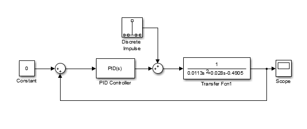 The closed-loop system with a 0.1 Nm impulse disturbance torque input was created in Matlab. It was determined that this torque was sufficient enough to represent small disturbances that the robot might encounter during normal use. Also of note, as seen in the Plant Model section, this impulse was sufficient to cause the open loop system to go unstable.