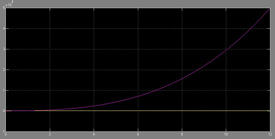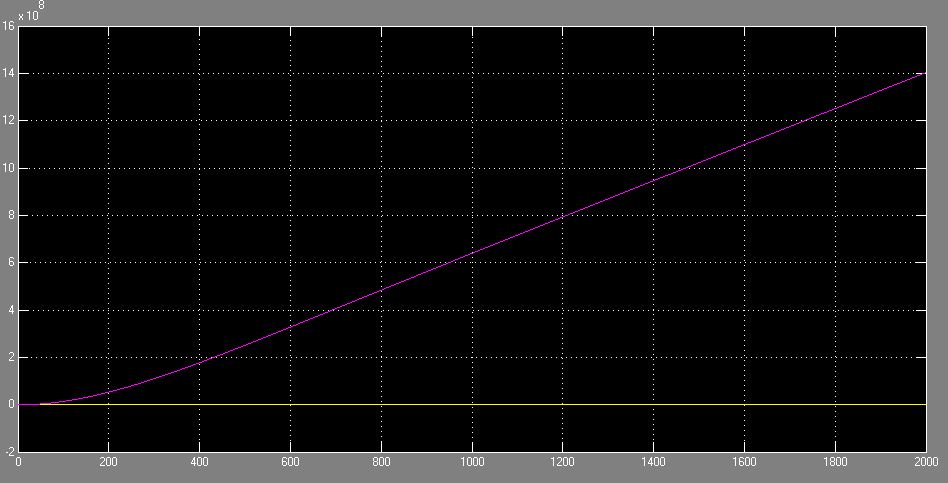 This is the closed-loop, second-order, non-linear system with variable coefficients - namely a linearly decreasing mass and a G that decreases as the rocket gains altitude. The input is a step of 1+(rocket initial mass * 9.8). Since the variable mass and G is being fed back, we expect this graph to be accurate to our linear assumption for a very short period of time, as we are starting with an equivalent step input. Then, as time as well as the difference between the assumed mass / gravity and actual mass / gravity starts increasing, the non-linear system starts diverging from our original graph.