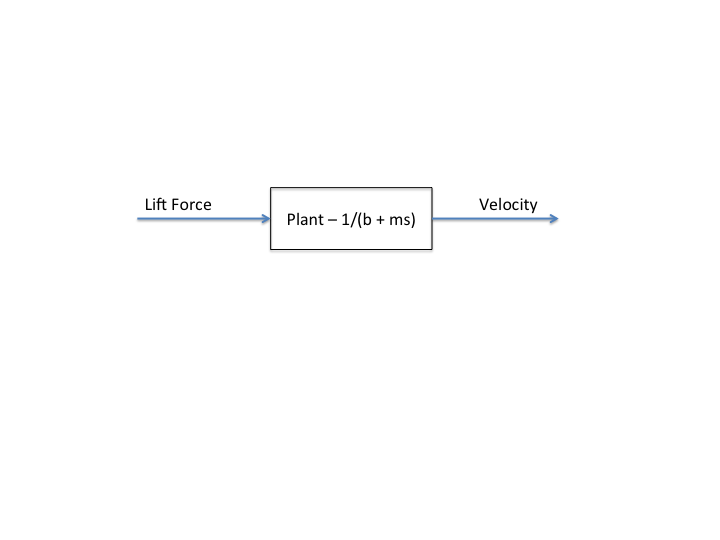 We use Newton's equations of motion to determine the controlled velocity of an accelerating rocket. We model drag due to air resistance as a linear damping force proportional to the rocket's velocity. In the linear case, we take the mass of the rocket, m, and acceleration due to gravity, g, as constant. Assuming no motion in the horizontal direction, this results in 3 forces acting on the rocket; lift, drag, and gravity. Because gravity exists as a "steady-state" force that is not dependent on the rocket's velocity, we define F 'lift = Flift - mg, which simplifies the control analysis, allowing for a closed-form solution to the plant transfer function.