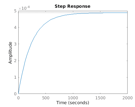 Although the open-loop behavior converges to a final steady-state value, it does not converge in a suitable time-scale (reaching a steady-state value well after the desired 900s) and has substantial steady-state error. We need to design a controller that drives steady-state error close to zero while increasing the speed of response. We also hope to replicate, or at least approach, the lack of overshoot in the open-loop system.