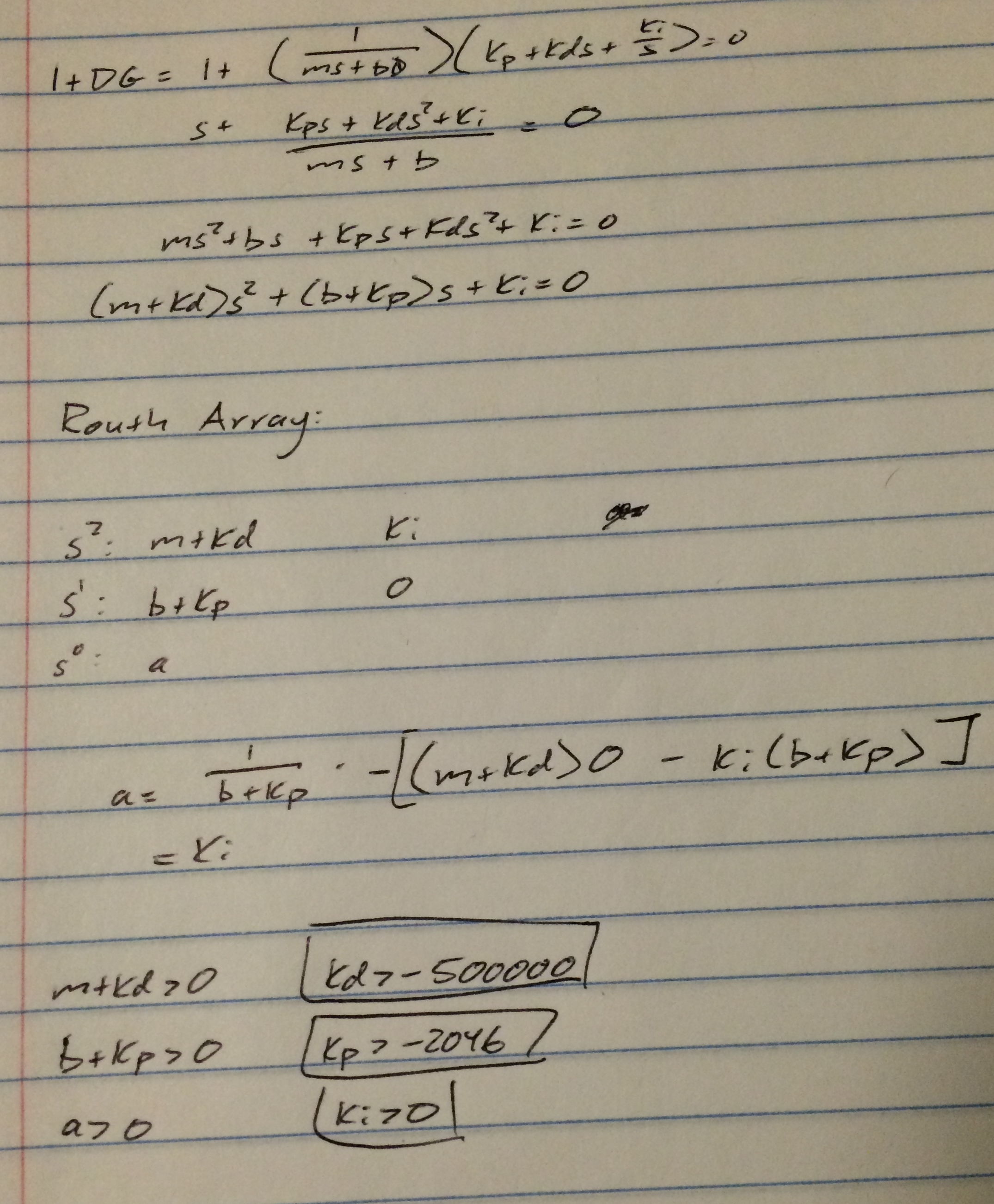 In order to determine the values of our controller gains, we first found the range of kp, kd, and ki that would stabilize the system using a Routh array on the characteristic equation 1 + DG.