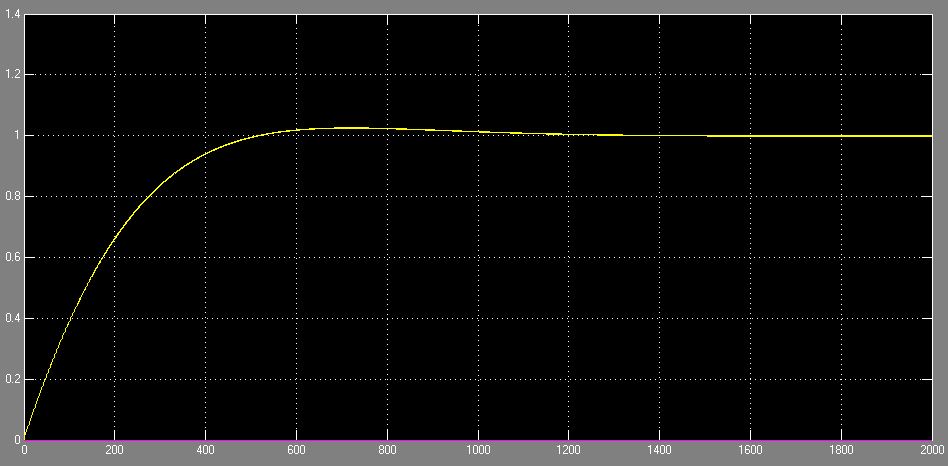 To fix the steady-error, we introduced integral control. We increased the value of kp and kd to 500 to speed up the response and try to minimize error. To maintain our original goal of little to no overshoot, we left the value of ki low (ki = 3). This controller converged to a steady-state value of 1, but was again too slow, and we did not want to keep increasing the value of kp to speed up the response (as this would eventually become hard to physically realize with a real controller).