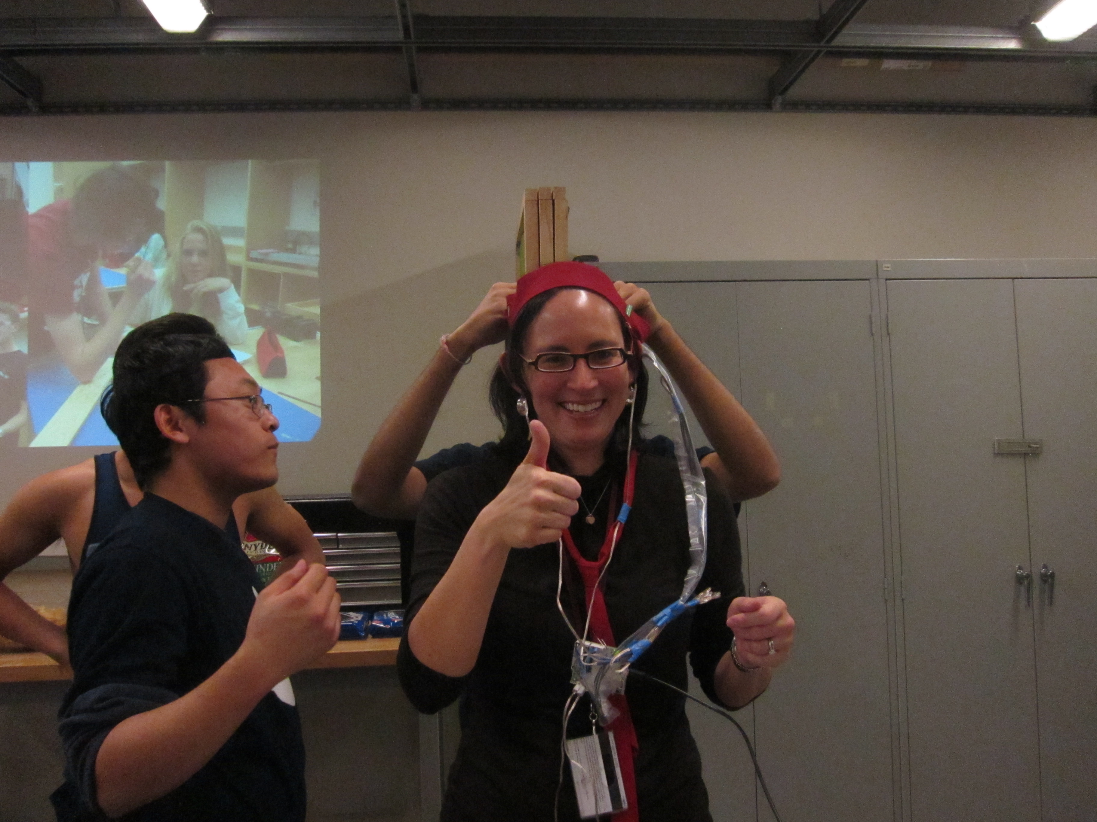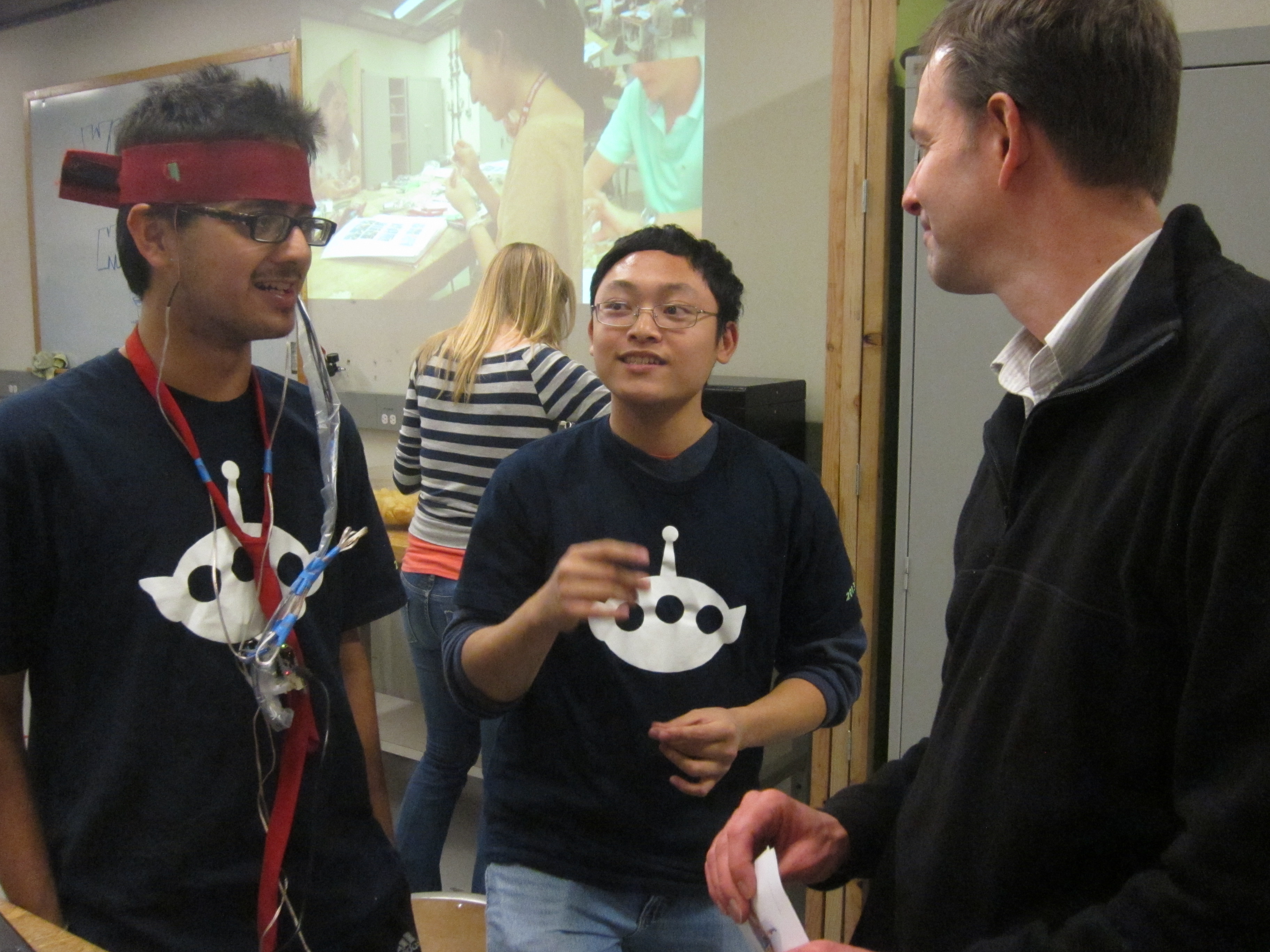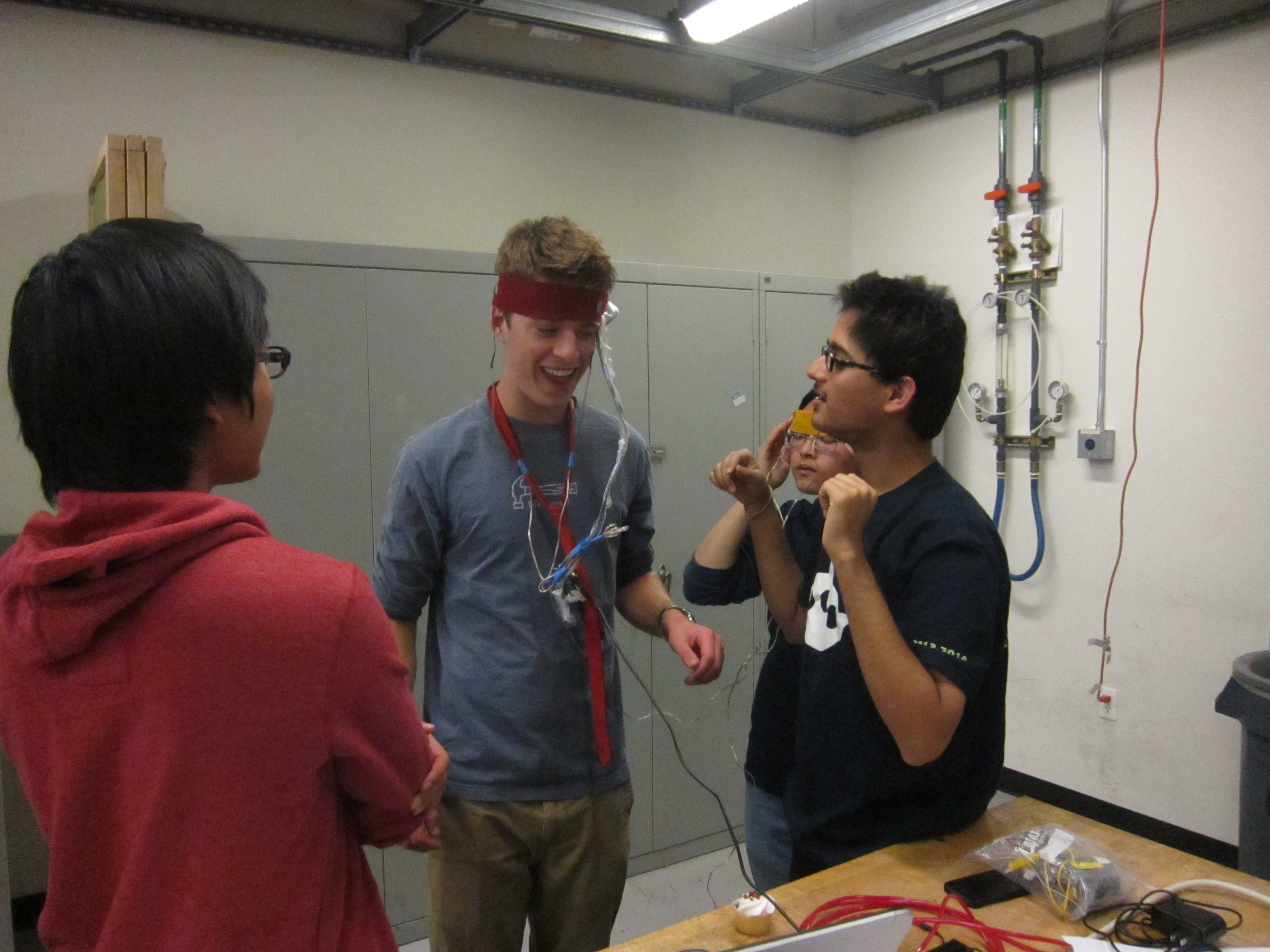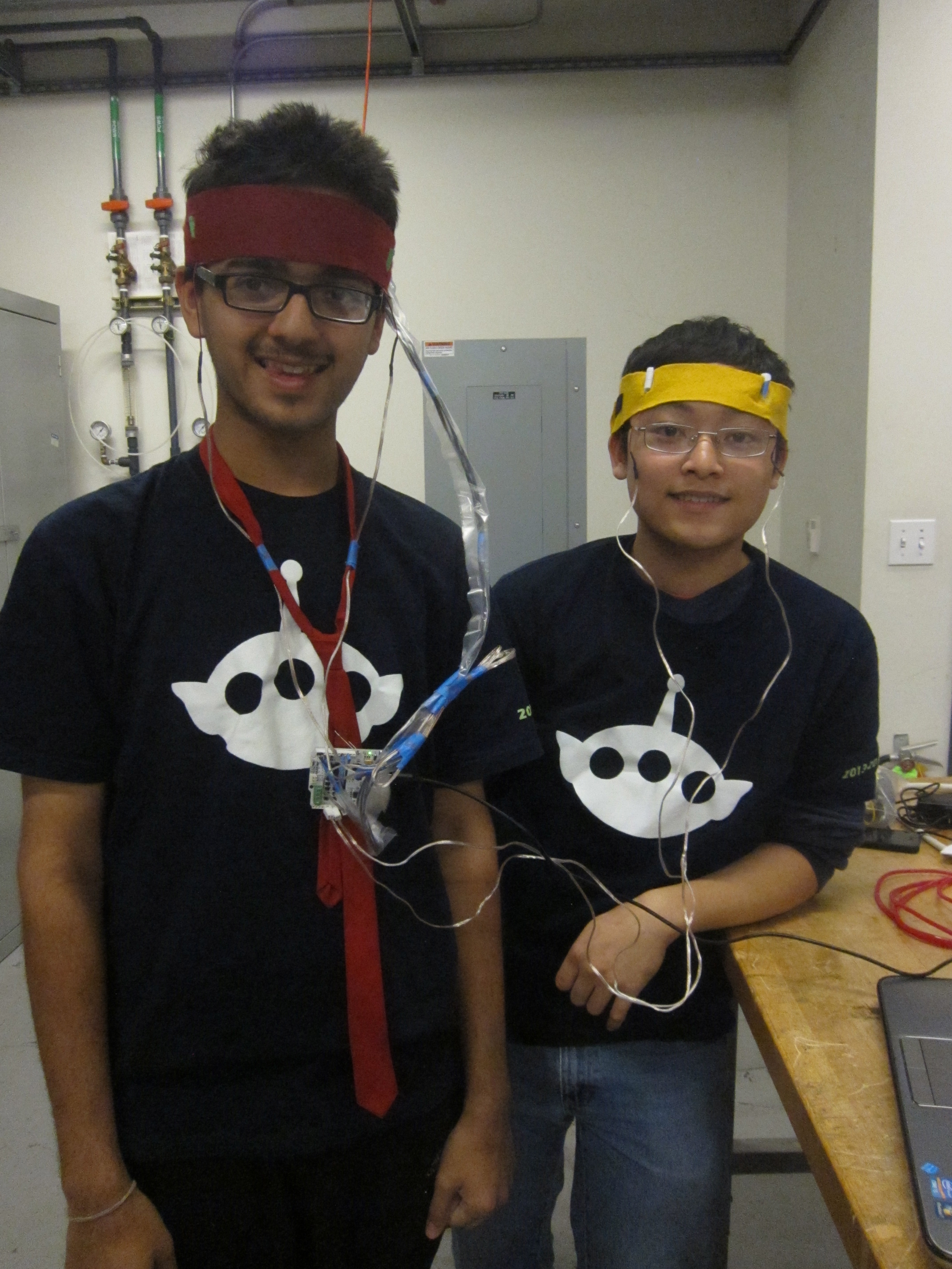 The headbands were made from two strips of cloth. We attached Velcro strips to the headbands to adjust them for different sized heads. We then wrapped the four vibrators loosely in rolled up paper. This was to prevent the motors from getting stuck and not vibrating. Without the paper, they may have been pressed too tightly to a surface and stop rotating. The vibrators were attached to the headband, near the temples of the head. The vibrators pins were then connected directly to the hapkit board. We defined different digital pins as ground and power to provide voltage to the vibrators. The gyroscope we used to measure head bangs was a Parallax 3-axis L3G4200D. Attaching it to the hapkit board was more difficult. Five 3.5 ft wires were bought from the PRL. One end of each wire was crimped onto a contact pin and inserted into a female to female connector bought from the PRL. The other end of the connector was plugged into to the gyroscope's pins. The other end of wire was soldered onto a male to male connector pin and inserted into the hapkit circuit board. To make the project slightly more portable, the circuit board was unscrewed from the acrylic base of the hapkit and attached to a red tie via a safety pin. The wires leading from the hapkit board to the gyroscope were tied off close to the hapkit board with a ziplock tie. This would lessen torsion on the wires, making them less likely to fall out of position. At regular intervals, tape was used to bundle the wires, making the setup neater. For aesthetic reasons, the wire was wrapped in plastic (a portion of a trash bag) and stapled. The gyroscope was then attached with tape to the left side of the red headband. The person wearing the red headband would also wear the red tie and would control the vibrations. The person with the yellow headband would feel the vibrations only.