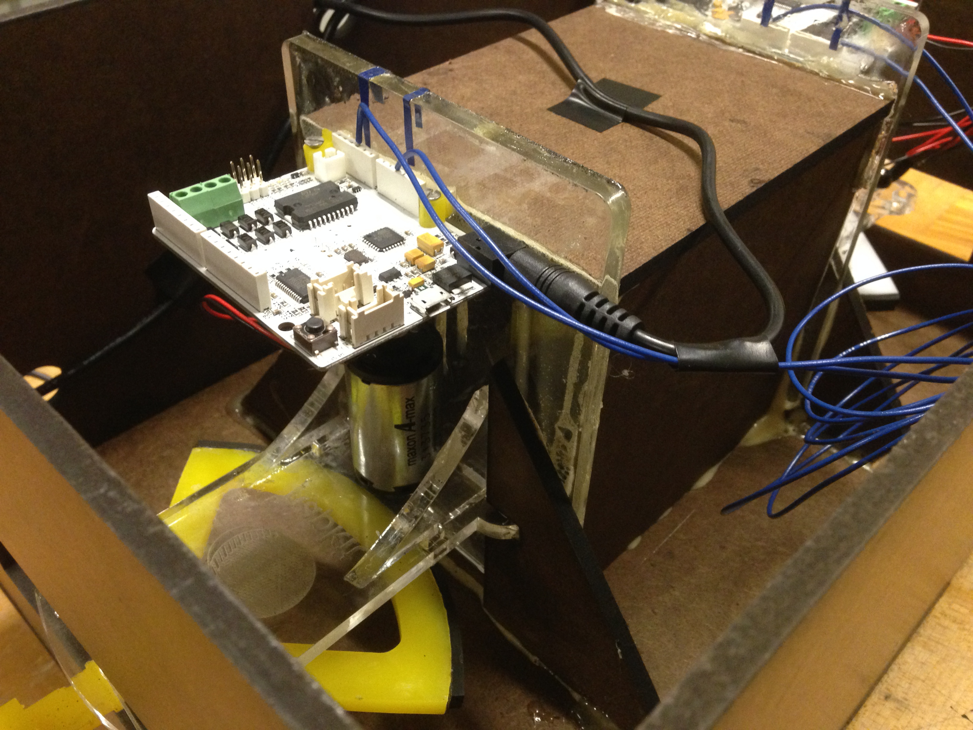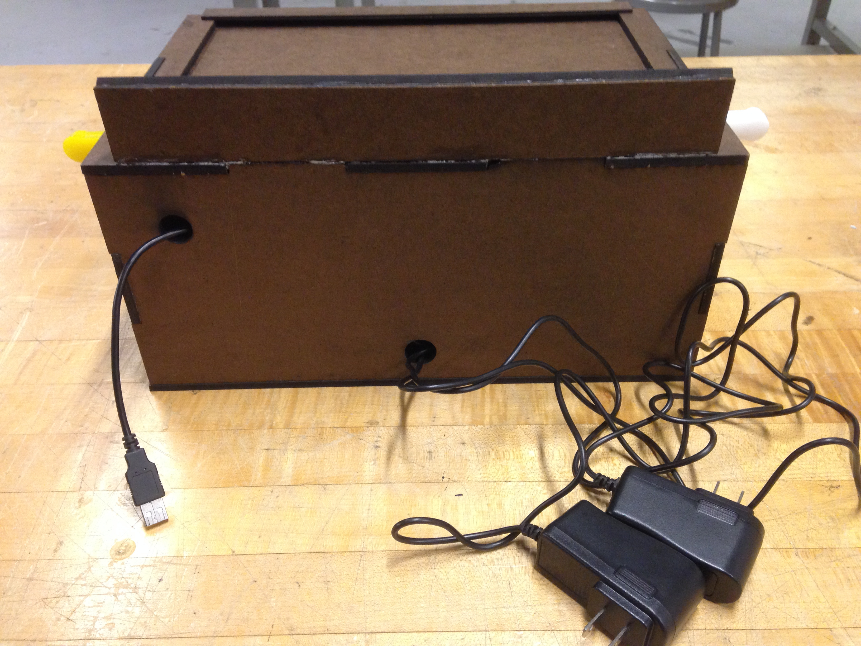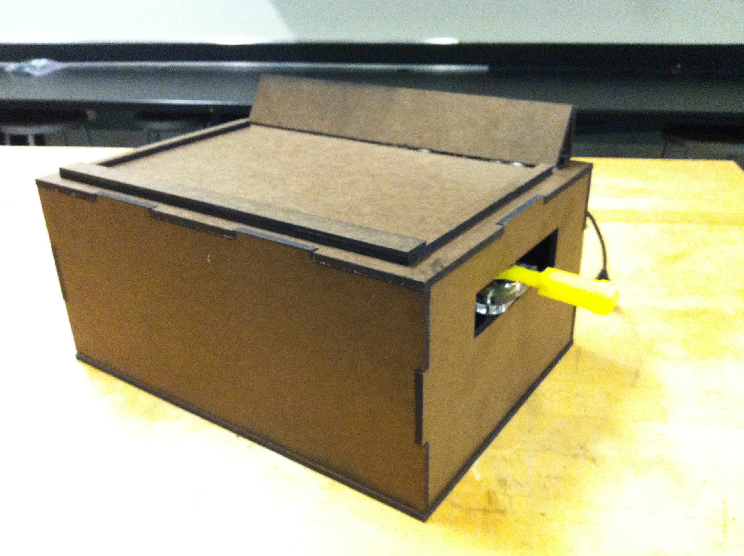 Because the motors of the Hapkits output enough force to inhibit a user's movement when a power up is activated, the mounting of the box must be very secure. For this reason, the box in which the Hapkits are mounted has puzzle-like notches along each edge in order to increase surface area of the adhesive holding the box together (if duron is used as material, wood glue works well for this portion of construction).