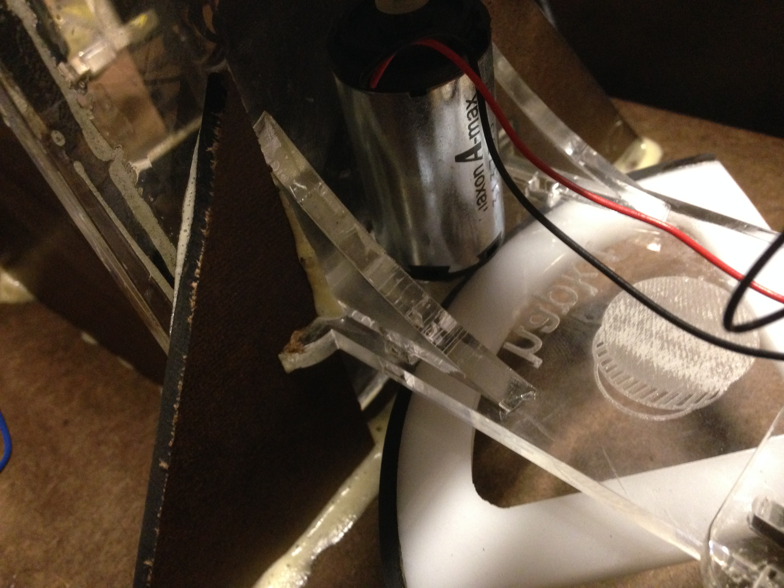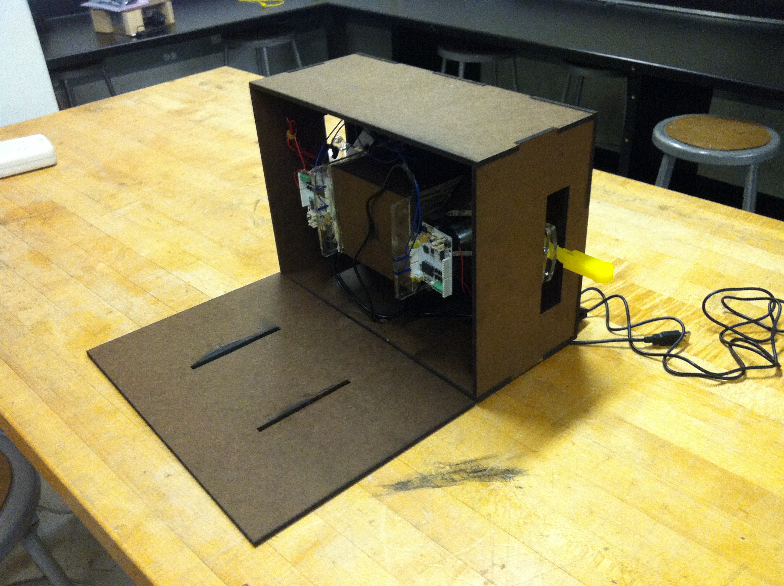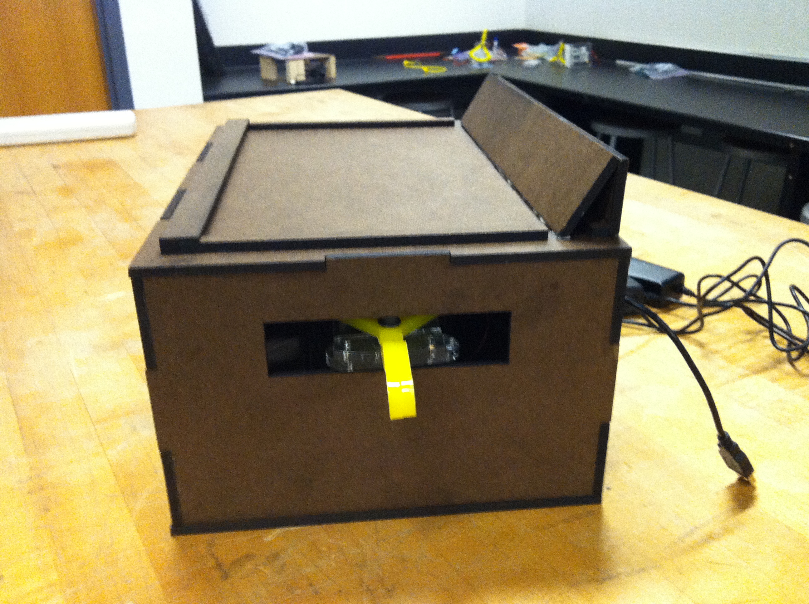 Because the motors of the Hapkits output enough force to inhibit a user's movement when a power up is activated, the mounting of the box must be very secure. For this reason, the box in which the Hapkits are mounted has puzzle-like notches along each edge in order to increase surface area of the adhesive holding the box together (if duron is used as material, wood glue works well for this portion of construction).