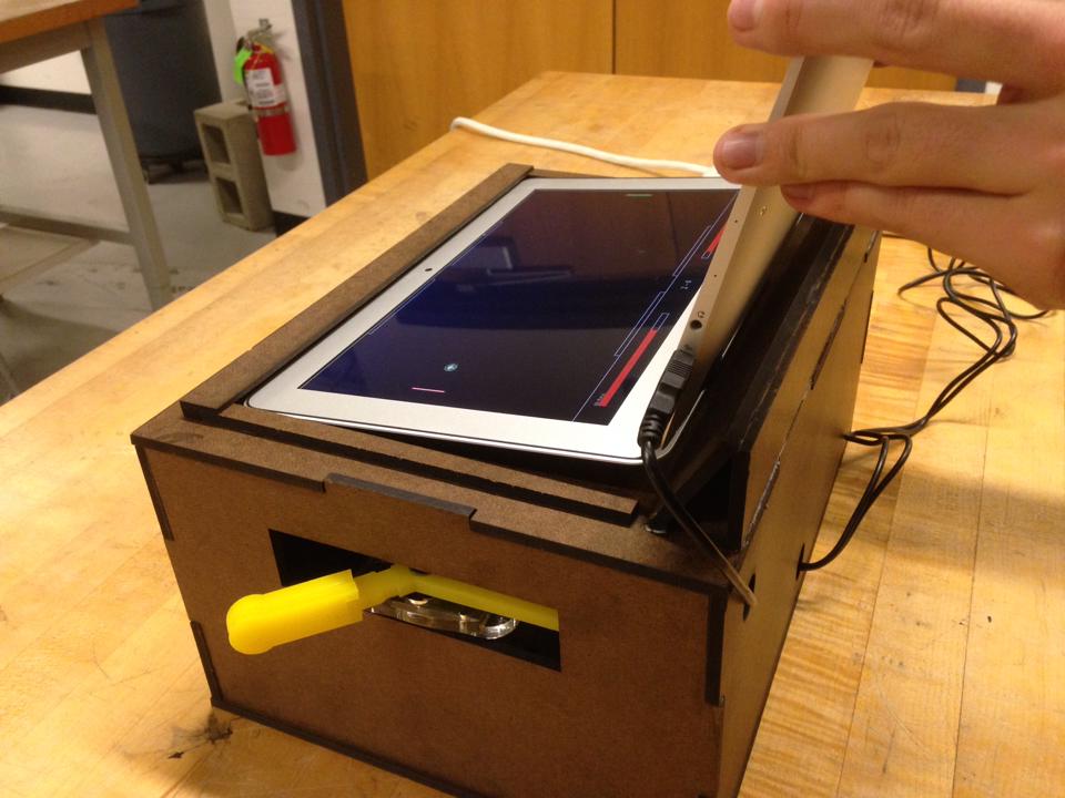 The device functioned almost completely as designed, except for once in a while the virtual paddle would move off the screen because the magnetoresistive sensor would lose count of the rotations of the magnet on the end of the motor's axle. As a result, the program would lose track of the position of the player's paddle. We received very positive feedback during the open house, and the only comment that implied that we could improve the design was that the paddle shouldn't move off the screen, which can easily be fixed by using a more accurate (and expensive) sensor in place of the magnetoresistive sensor. The most technical question we received was if our device "updated" faster than 500Hz (the "magic number" for producing very realistic haptic feedback), which it doesn't simply because the time it takes for the two Hapkits (which utilize what is essentially an Arduino Uno board) to communicate slows down the update rate.