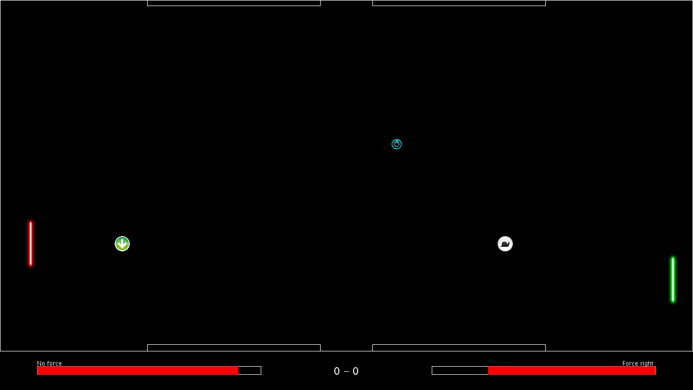 When a user's virtual paddle is struck by the ball, the handle they are physically holding onto exerts a force onto their hand which mimics the feeling of actually hitting a ball with a paddle. When a player's virtual paddle comes in contact with a power-up, the user will feel a specific force that inhibits their ability to physically move their paddle in a desired direction. There are four haptic-effect-driven power-ups. There is a power-up that causes a force that pushes the player's paddle upwards. There is one that causes a force that pushes the player's paddle downwards. The third power-up causes a dampening effect on the player's paddle which impedes the user's movement in either movement with a force that is a function of the user's paddle's velocity. And the final power-up causes a seemingly random force that moves the player's paddle in one direction and then the other. If a player successfully hits their opponent with one of their power-ups, any force they would be feeling is eliminated.