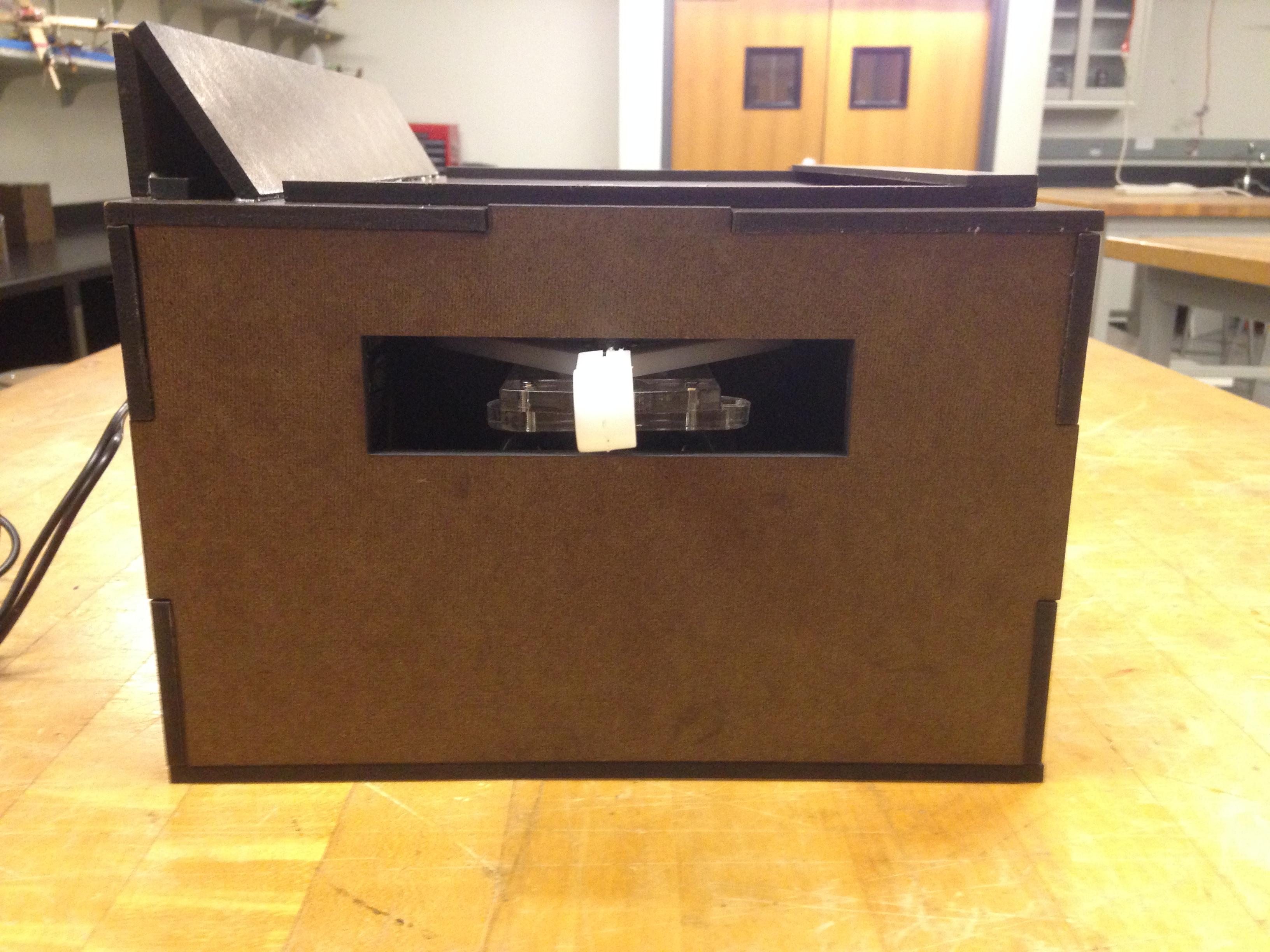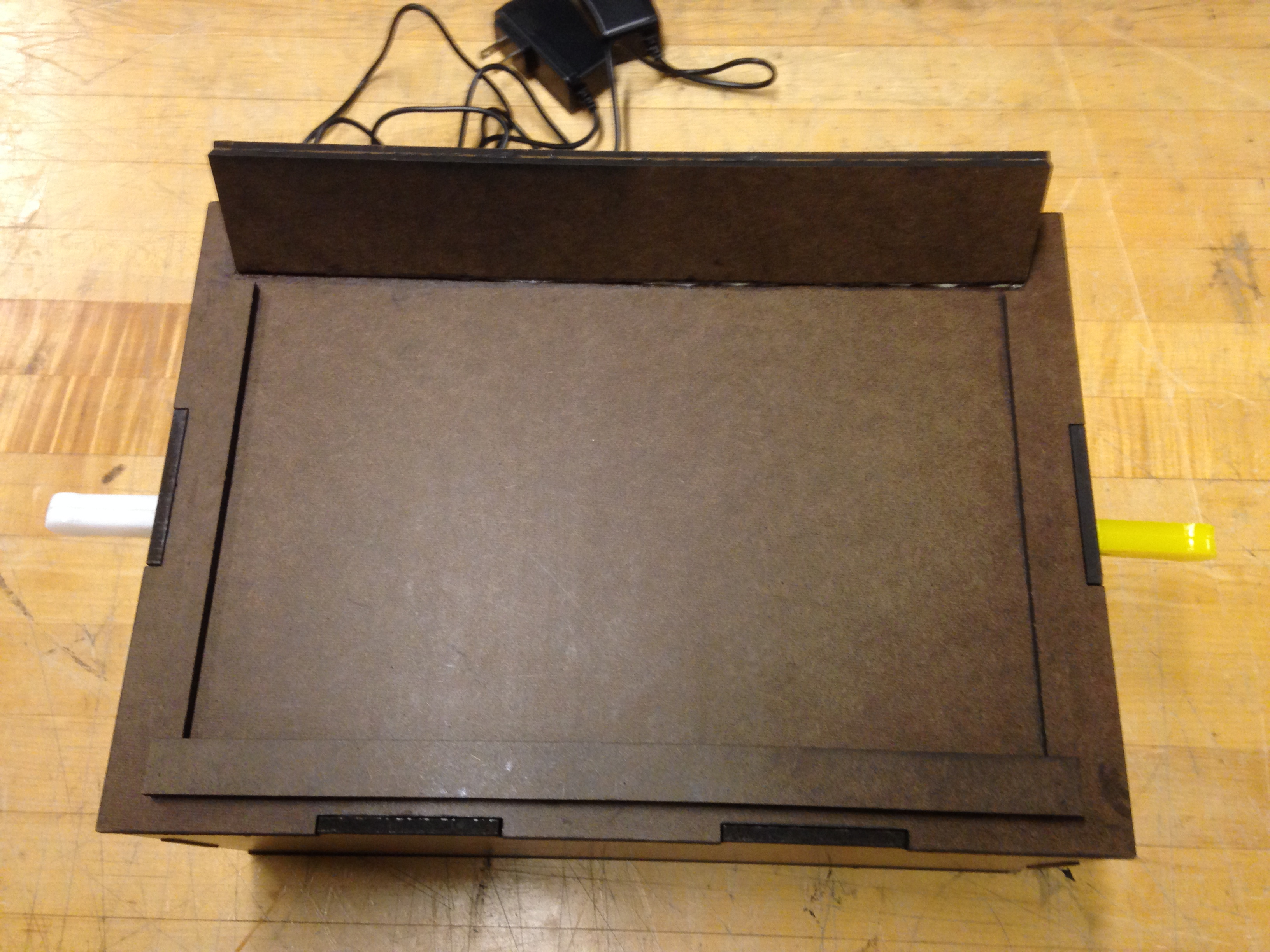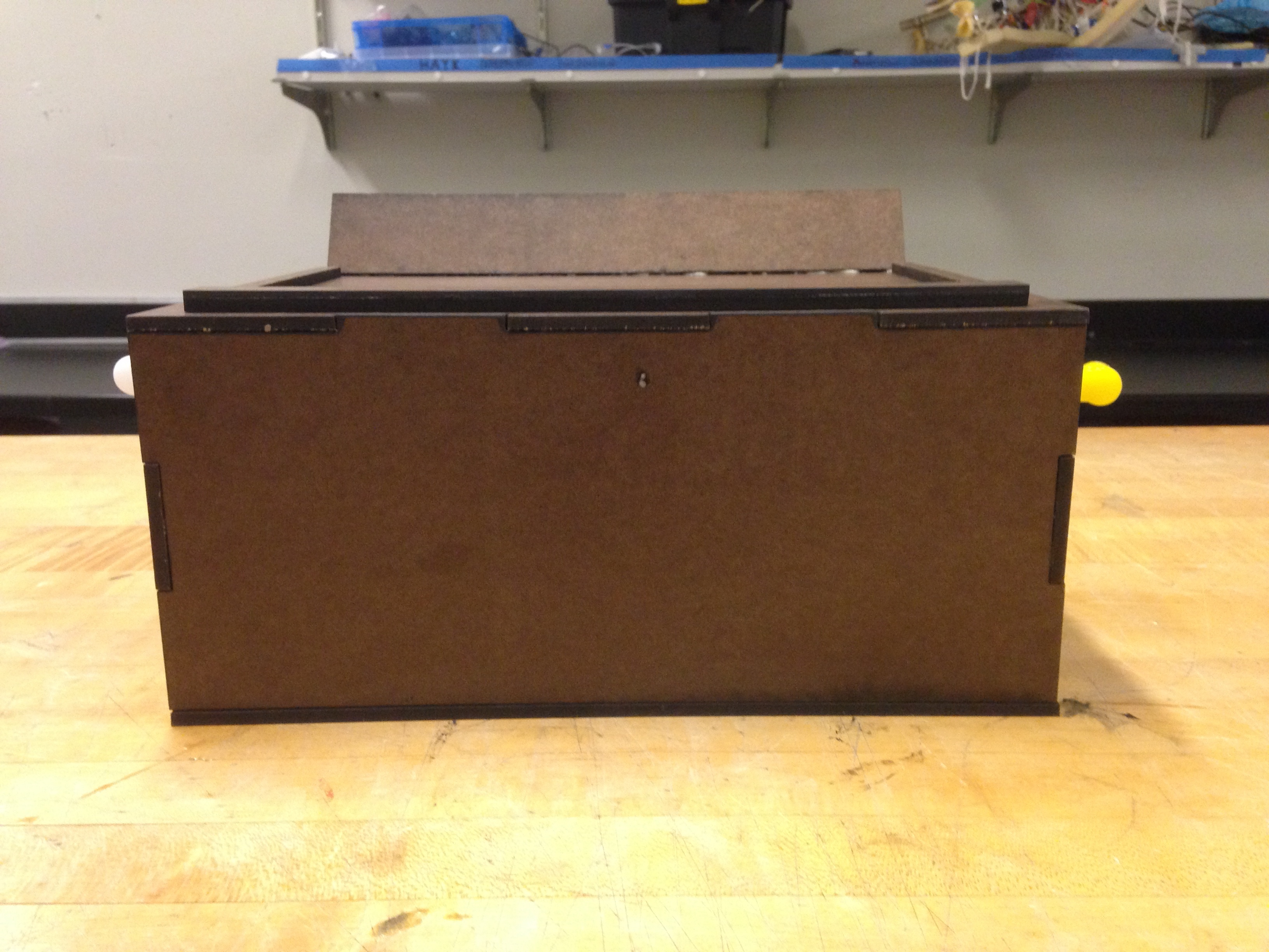 In order to secure the laptop on the top of the box, thin rectangles of material are placed along three sides of the laptop (the side which the keyboard is attached to is left alone for now). Those boards will be referred to as support boards, and once they are glued to the top of the box, a thin piece of material (in our case, 1/8th in duron) is glued on top of the long computer support board so that it latches over the display of the laptop. This prevents the laptop from tipping over. The bottom of the laptop is supported by rectangles of duron glued such that they form a triangular prism, further supporting the laptop and preventing it from toppling off the box. If the prism is spaced correctly, the laptop should be able to slip in and out of the mount. Securing the laptop to the top of the box is heavily dependent on the specific laptop that will be used. The pictures of the laptop mounting included in this page will be most useful for getting a rough idea of what it should look like. Depending on the laptop being used, modifications can be made as needed.