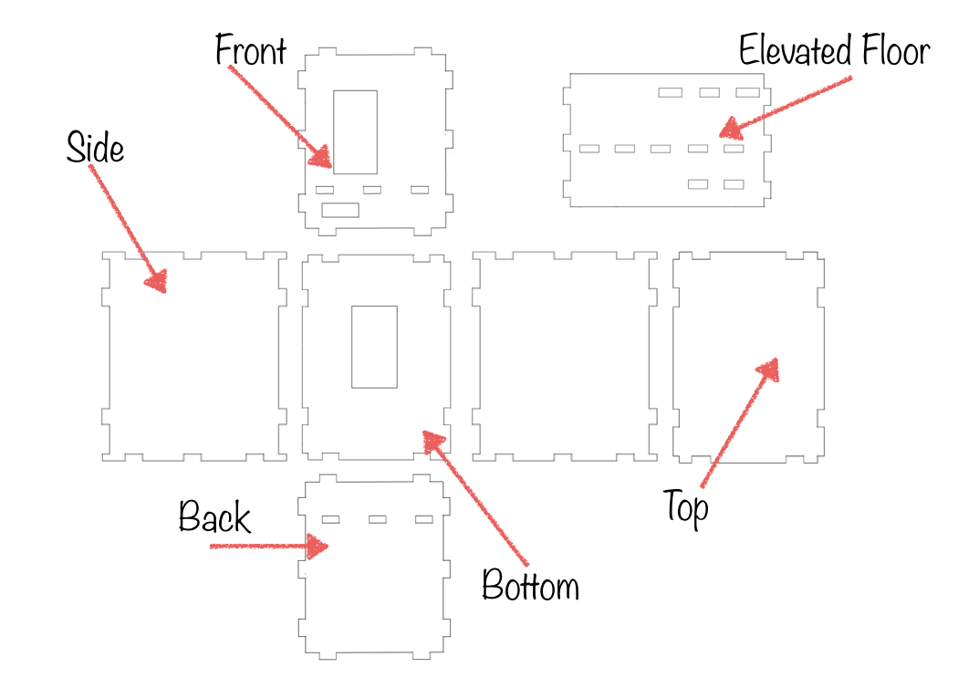 The structure of the haptic bubble wrap was laser-cut with clear acrylic. The designs of the structure were created in Adobe Illustrator. The box has a higher floor with holes to interlock the bases of the sector pulley, the motor and the haptic board. The bottom space is left for the mouse. The box was assembled together by interlocking the sides of the rectangles with rectangular tabs corresponding to rectangular dips.