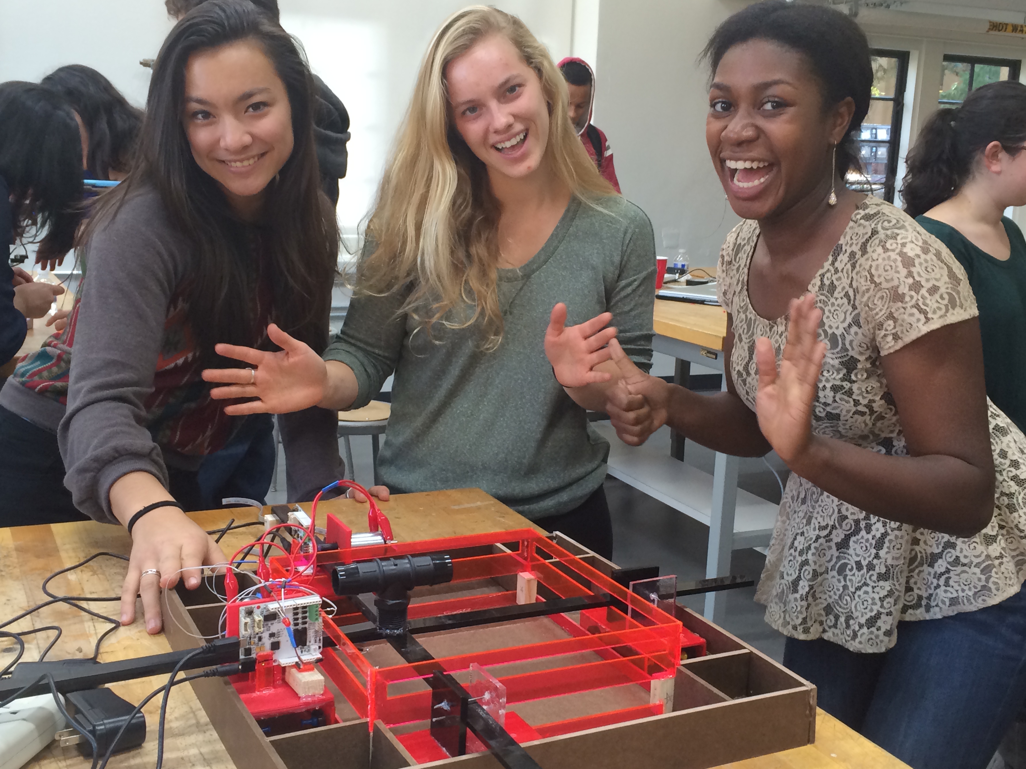 Thanks so much to Allison for giving us the opportunity to do this project, and also for her help as we designed, built, and coded. A big thank you to her student assistants as well, particularly Jeanny for all the time she spent on this class and especially for helping us learn to use SolidWorks. Big thanks to Akzl Pultorak and Rishi Bedi as well. Akzl helped us with SolidWorks and Rishi responded to a late night email to come help us work through some major programming issues in the classroom at 11 pm! Thanks to the awesome Product Realization Lab TAs for their patience with teaching us to use all the equipment in Room 36 and the wood shop. Finally thanks to everyone in the class for being super supportive and inspiring us with their amazing projects! Our project would not have been possible without all of the help we received from so many different sources!