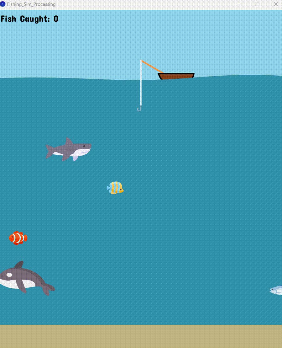 Also, on a different sketch, different fish were imported to the Processing rendering such that they vary in type (and thus size and speed). This will be utilized such that different fish will resist in various haptic feedback to the users experiencing the fishing simulator. The speed of each fish type is controlled, and they appear randomly to add some excitement to the game!