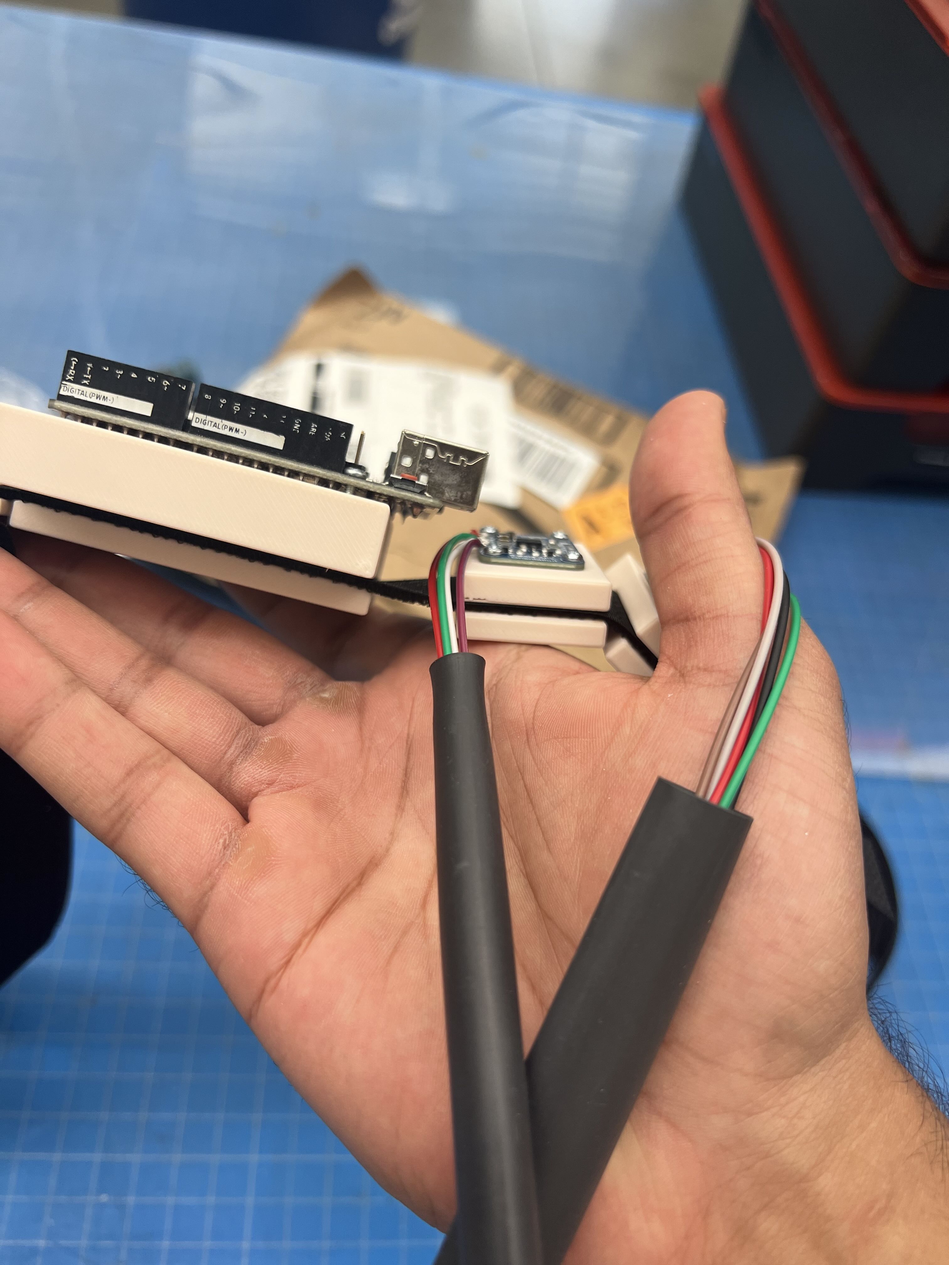 Additionally, we made a lot of progress on fabricating the physical vest set up that would host all of the electronics on board. We decided that we would use a combination of sown materials and velcro straps to design a vest that could easily attach to the user while providing a snug fit to ensure the vibration feedback was clear. The first step in this process was moving from the breadboard to a protoboard, at the same time improving the wiring of our system and cleaning it up with additional insulation and heat-gunning. Next, we dedicated a lot of time to 3D-Printing custom clips for different electrical components to allow easy attachment to the velcro straps. We also spent time sewing fabric for a vest that would attach to the velcro straps and hold some of our circuit components.