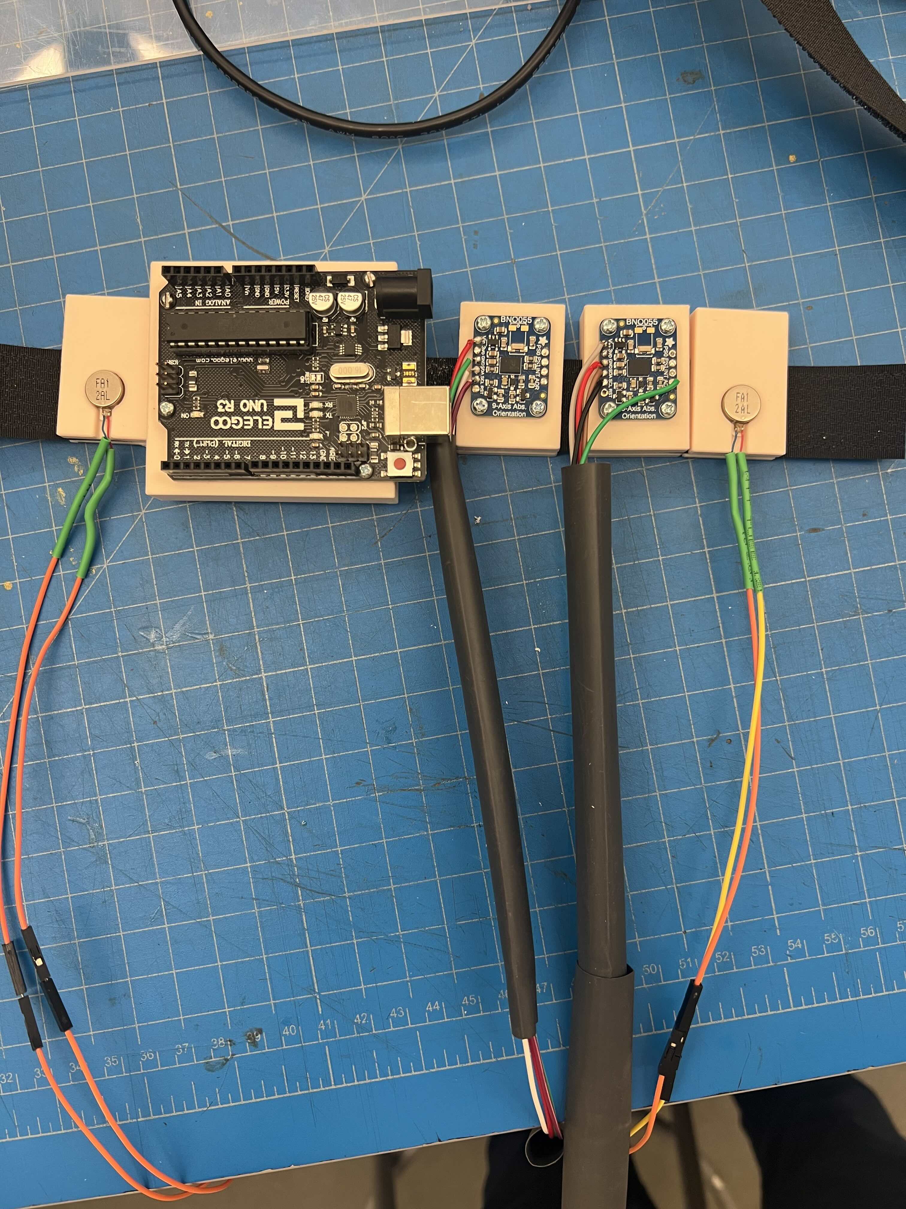 We use an Arduino Uno to gather live sensor data through I2C communication protocol. Both IMU sensors share the same SCL (Analog A5 input on Arduino) and SDA (Analog A4) lines to relay data to the Arduino, but have different identifying addresses. The Arduino sends PWM signals to the ERMs to induce vibrations at the specified amplitude when required. Our complete Arduino code can be viewed in the "IMU_Buzzer.ino" file found in our linked GitHub repository below in "Files". To keep the system portable, the Arduino is powered by a 9V battery through its barrel jack port. We also use a protoboard to relay 5V power, ground, and the SCL, and SDA lines across our IMUs and ERMs with reliable soldered connections.