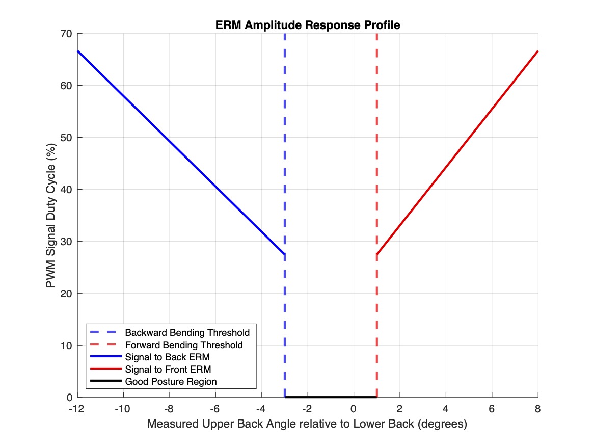As mentioned above, we set the ERM vibration strength proportional to the magnitude of the relative difference between the upper back and lower back IMU angle measurements. On startup, we average 5 seconds of calibration data to assess the difference between the two angles when the user is maintaining proper posture. Then, when the user slouches or hyperextends their upper back so that the relative difference between the two angles exceeds this average plus a specified threshold, the ERMs begin to vibrate. From testing, we noticed that a threshold of 1 degree for slouching is enough to represent bad posture. The maximum angle difference that we expect for slouching in extreme conditions is 8 degrees. Similarly, for hyperextension in the backwards direction, we notice that a range from -3 to -12 degrees captures the poor posture region. This type of poor posture is typically seen when the user is seated and leaning back. Within these poor posture ranges, we simulate a tactile “spring” sensation by increasing the duty cycle of the PWM signal sent to an ERM from the Arduino, which increases the strength of the ERM motor vibrations. When the poor posture range is first entered, we set the duty cycle to near 30%. As the poor posture increases, the duty cycle is increased proportionally until a maximum of near 70% when the relative angle difference reaches the maximum of the specified range. A plot of this proportional excitement of the ERM motors is shown below, with the measured relative angle difference (subtracted by the averaged good posture offset) on the x-axis and the PWM duty cycle sent to the respective ERMs on the y-axis.